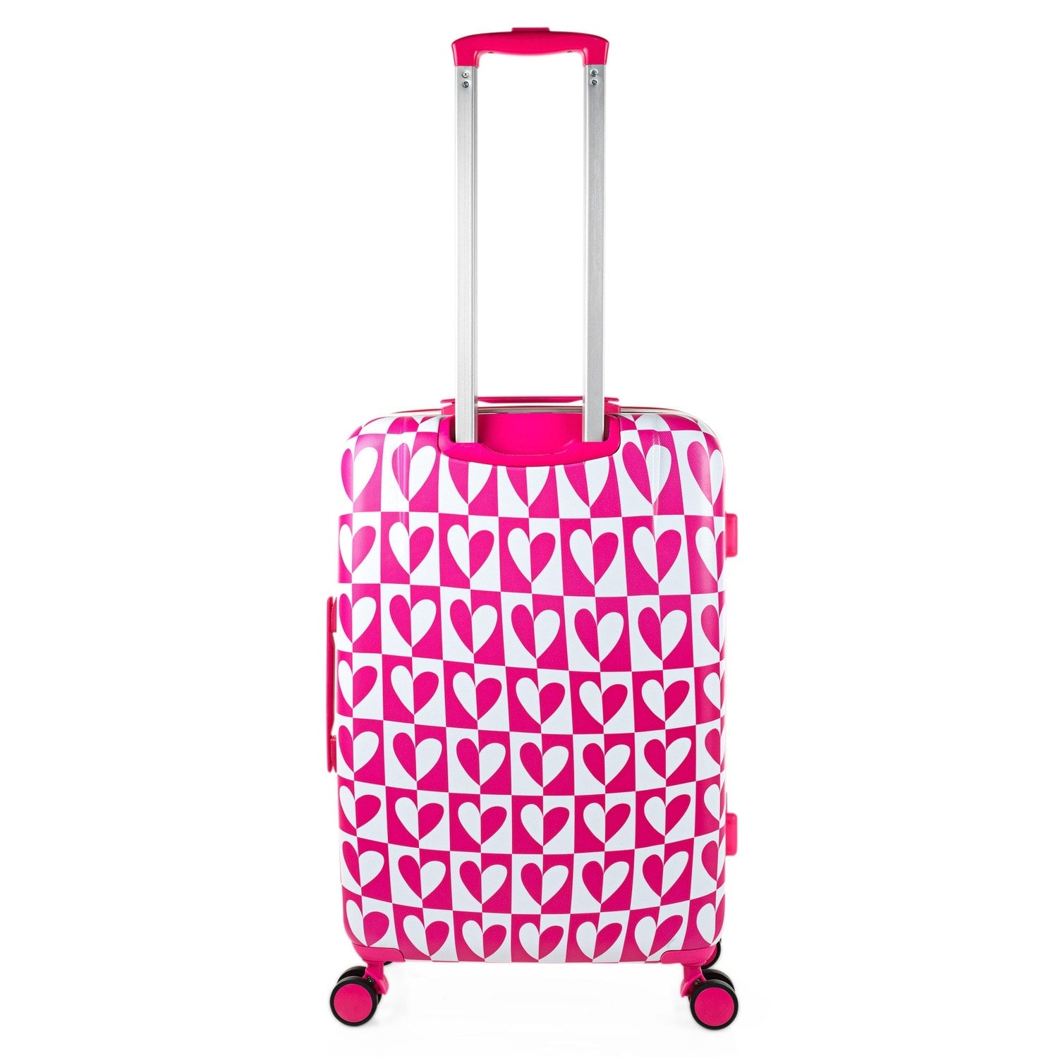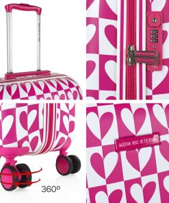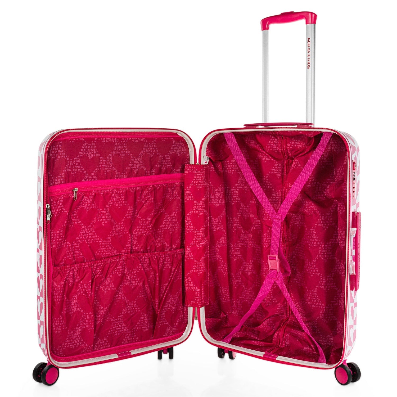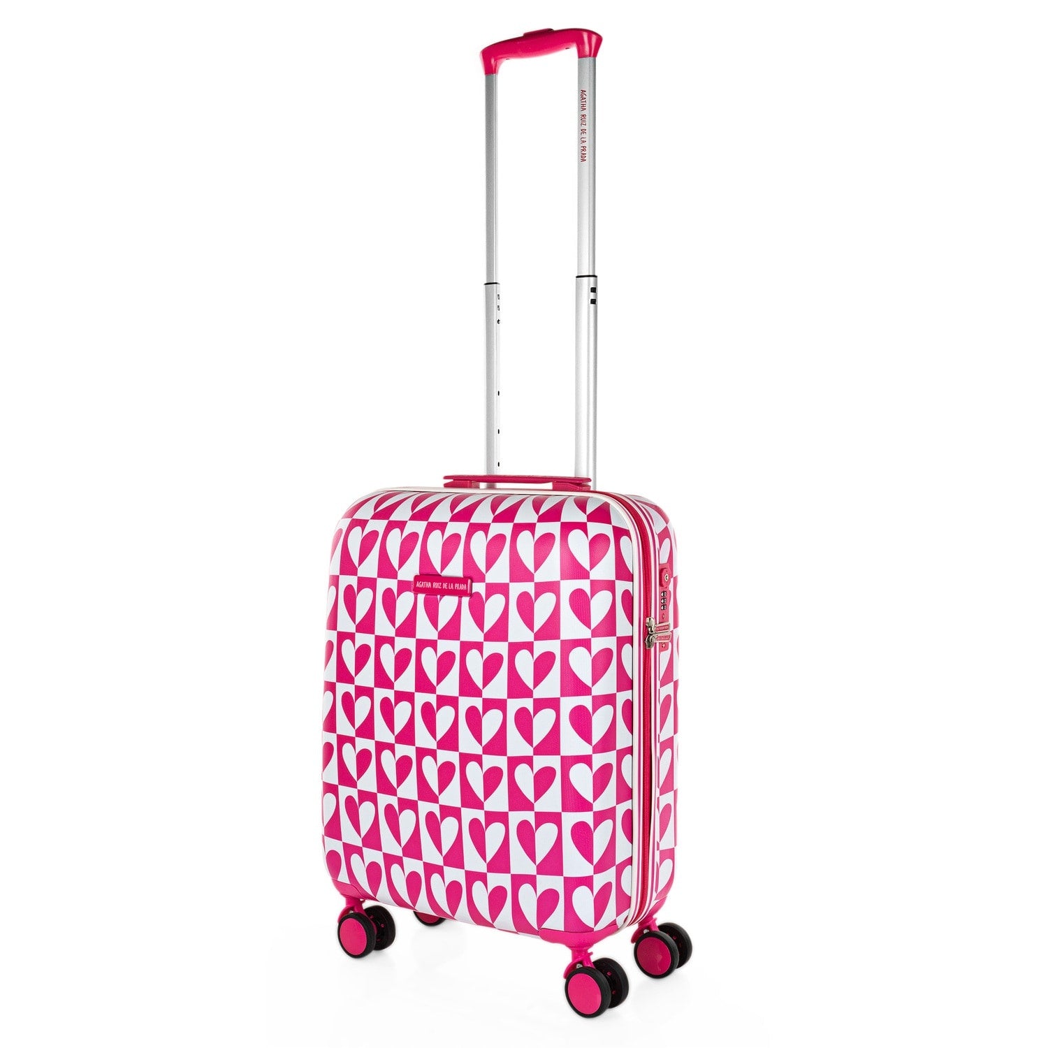 50L cabin suitcase in white with fuchsia and white mirrored hearts. 4 swivel wheels. Telescopic handle. Top handle and additional side handle Zipper closure with double slider. Interior divider with zipper closure Material: ABS/Polycarbonate Interior:Nylon Measurements: 40x55x19 Capacity: 34.5L Weight: 2.90 Kg. LOW COST CABIN SIZE ONLY FOR SHIPMENTS IN EUROPE