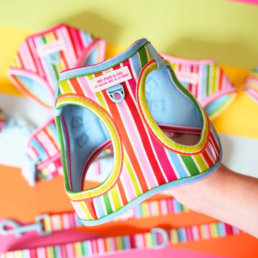 Special body harness for dogs that don’t like to stick their heads in harnesses. Super durable, comfortable, and safe. Super durable, comfortable, and safe. Easy to wash. Neoprene fabric on the outside. Breathable, quick-drying mesh on the inside. Metal D-ring on the back for leash attachment and on the front for ID tags. Reflective strips on the sides of the harness.