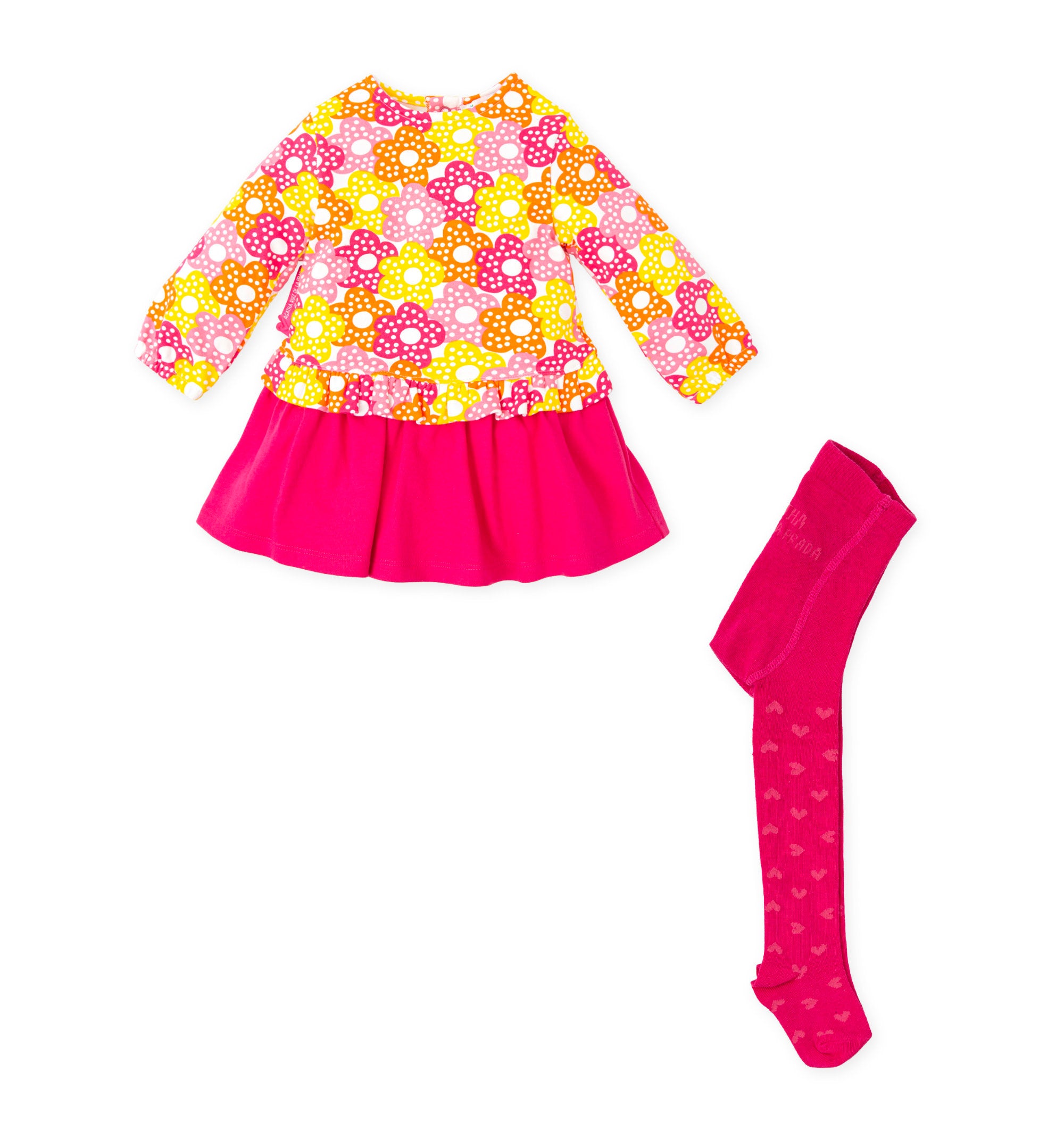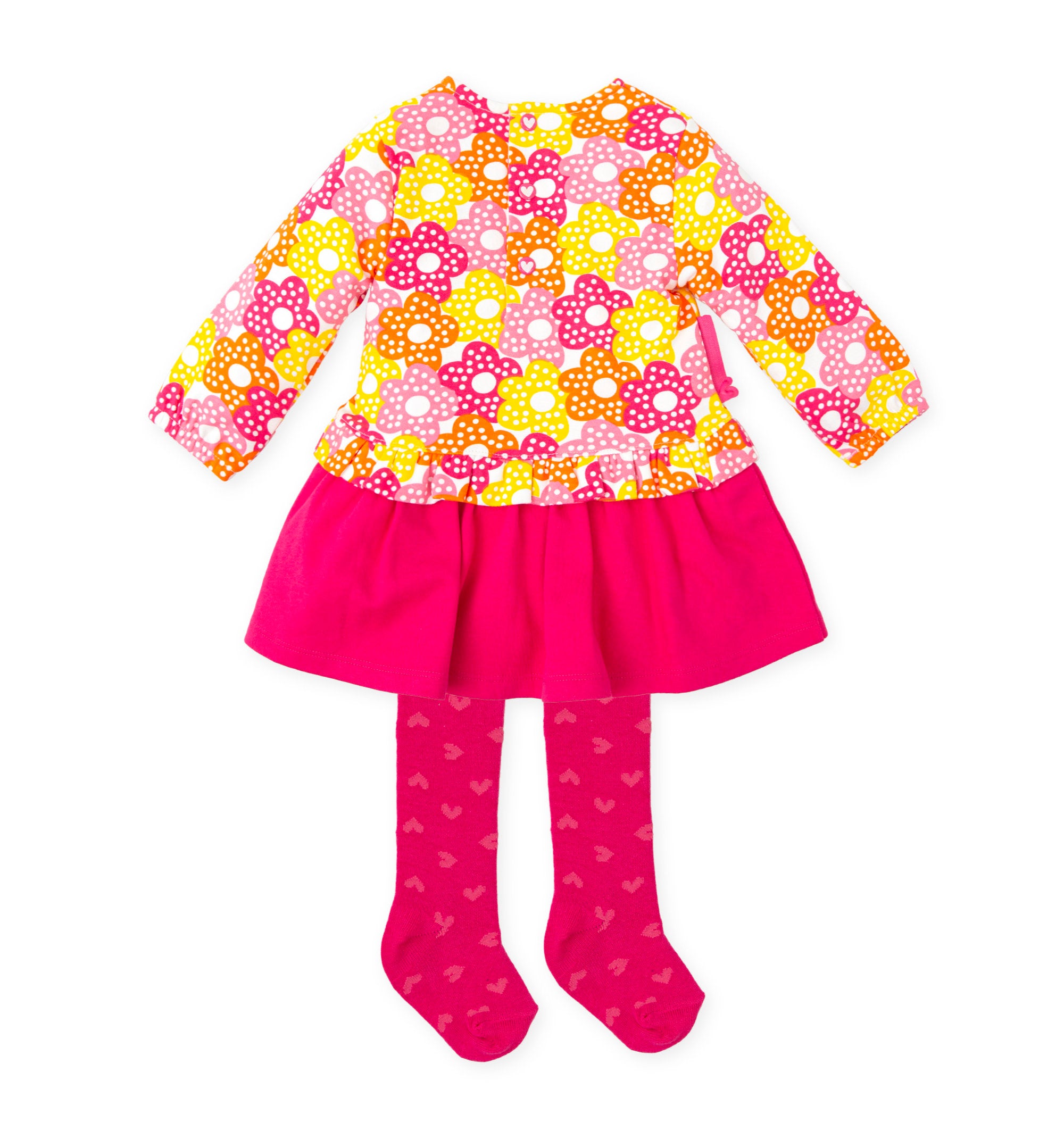 Round-neck, long-sleeved dress with a multi-colored print of yellow and pink flowers, a fuchsia-colored ruffle at the bottom, and matching tights. Part of the FLOWERS collection. Sizes from 3 months to 8 years. Do not dry clean. Do not bleach. Iron at medium temperature. Tumble dry at low temperature. Maximum water temperature 30º. DRESS: : COTTON 100% TIGHTS: : COTTON 80% POLYAMIDE 17% ELASTANE 3%