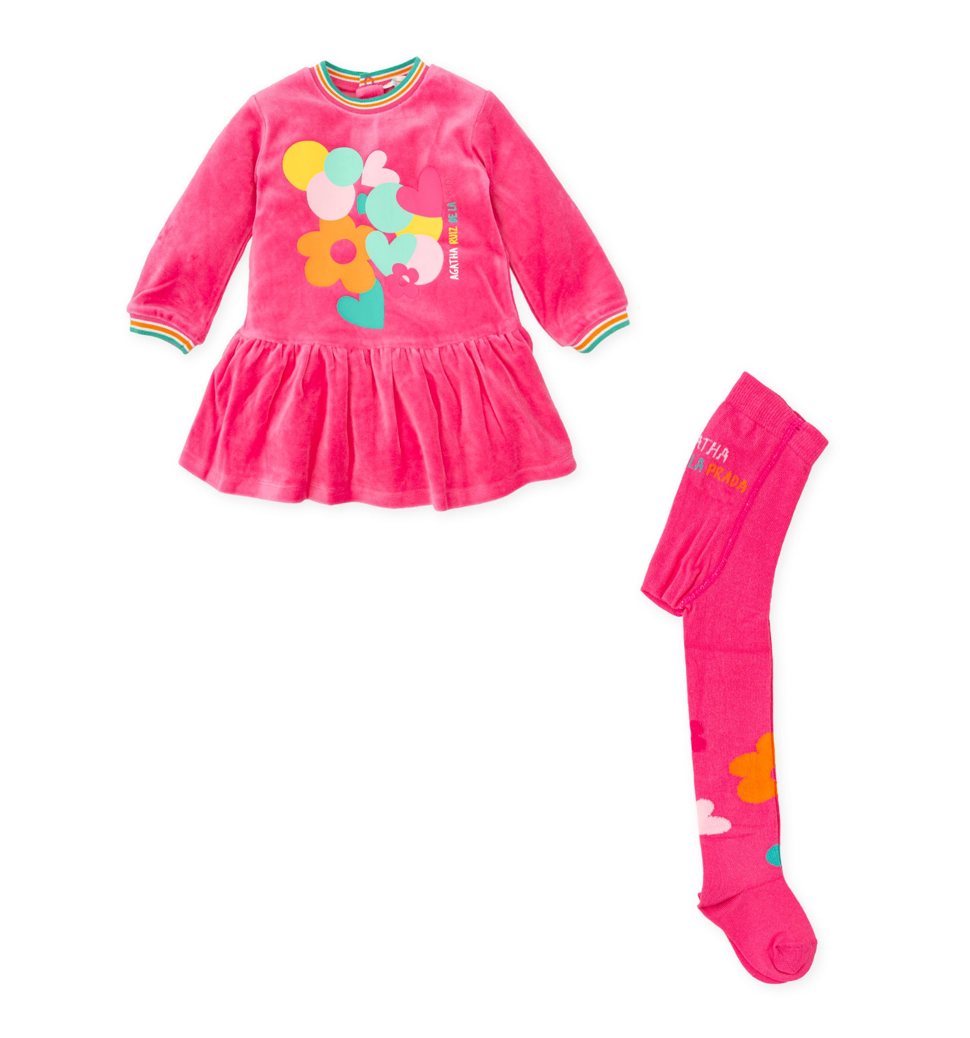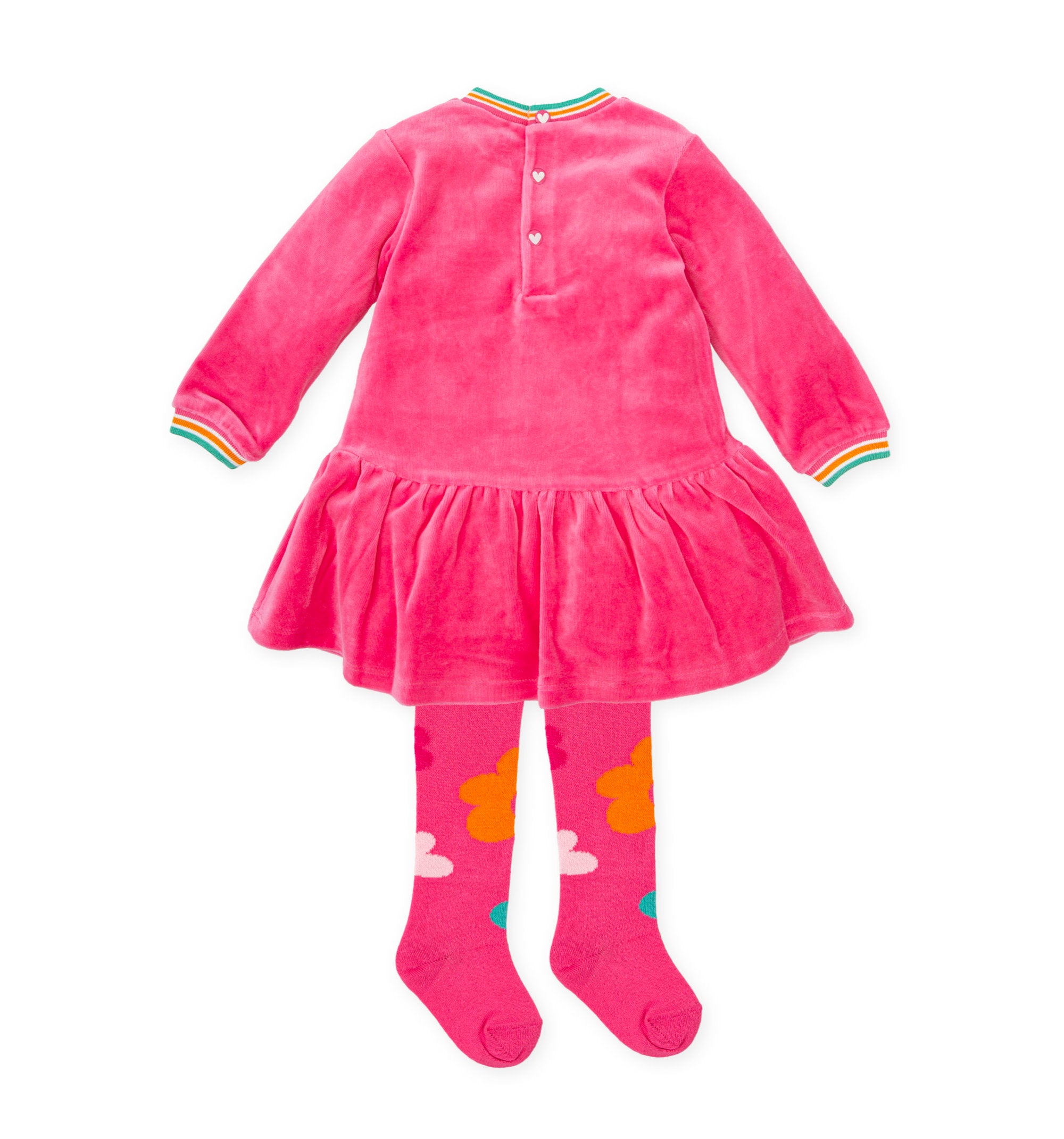 Fuchsia shearling dress with a round neck and long sleeves featuring colorful icons and matching fuchsia tights. Part of the PARTY collection. Sizes from 3 months to 8 years. Do not dry clean. Do not bleach. Iron at medium temperature. Tumble dry at low temperature. Maximum water temperature 30º. DRESS: : COTTON 100% TIGHTS: : COTTON 80% POLYAMIDE 17% ELASTANE 3%