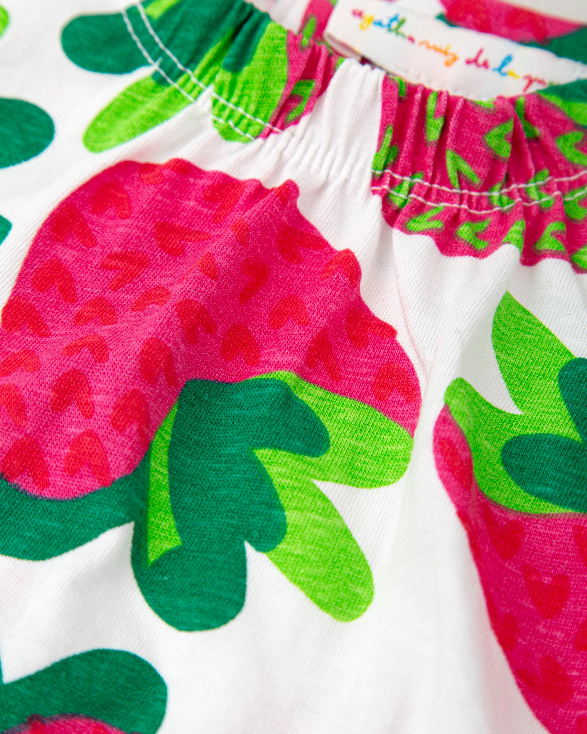 White strappy romper with fuchsia strawberries. Sizing from 0M to 24M. Machine washable, but do not exceed 30°C. Not resistant to bleach or other chlorine bleach. These garments can be tumble dried, but at a moderate temperature. These garments can be ironed at a maximum temperature of 150°C. This garment cannot be dry cleaned. Like all our garments, it carries the AITEX quality certificate. COMPOSITION: 100% COTTON