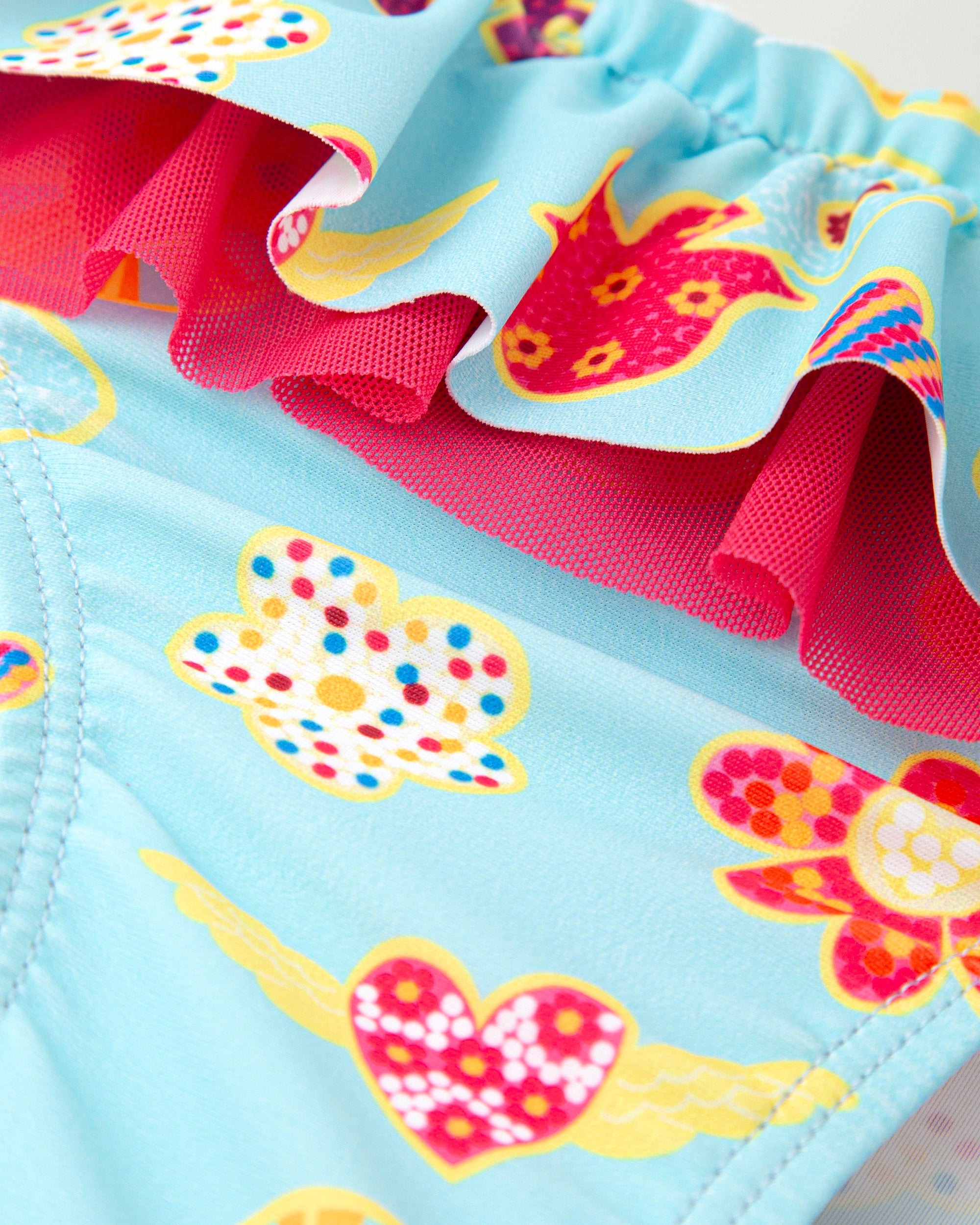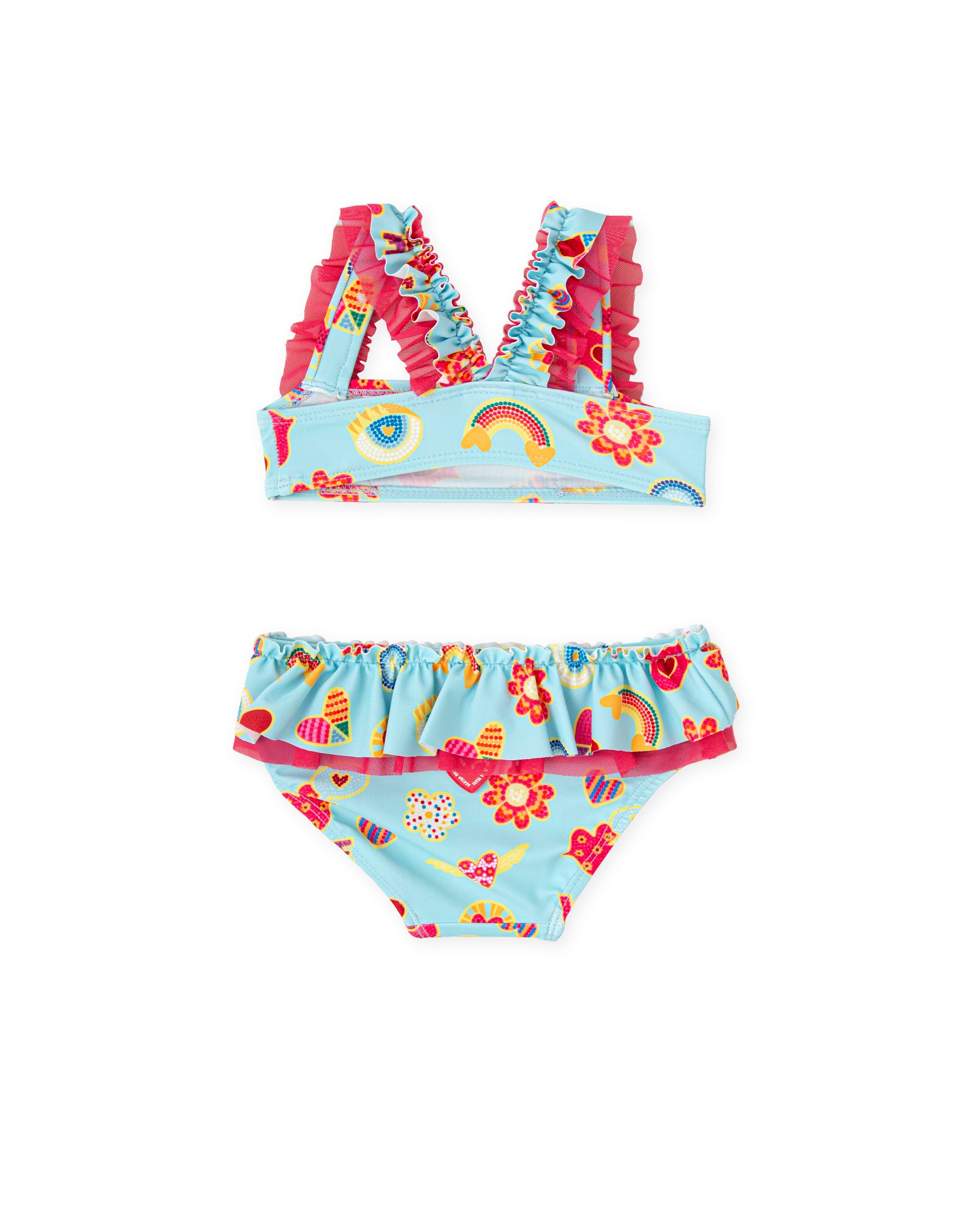 Blue bikini with colorful icons and matching bottoms. Sizes from 4A to 8A. Garments not resistant to bleach or any other chlorine. Garments suitable for washing in the washing machine, but not exceeding 30º. Garments not resistant to ironing. The garment cannot be dry cleaned. Like all our garments, it has the AITEX quality certificate. COMPOSITION: TOP: POLYAMIDE 90% ELASTANE 10% BRIEF: EXTERIOR: POLYAMIDE 90% ELASTANE 10% LINING: POLYAMIDE 93% ELASTANE 7%
