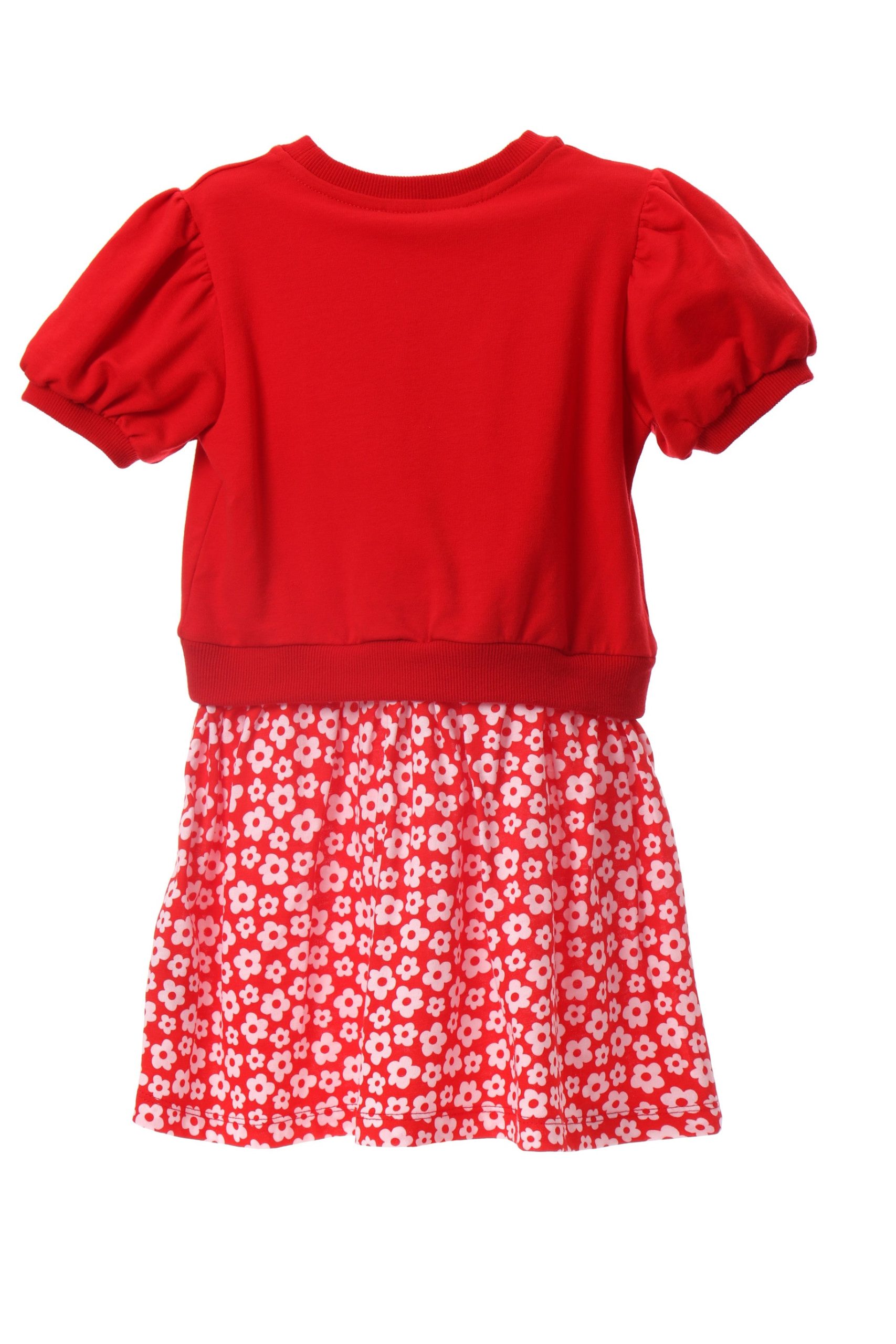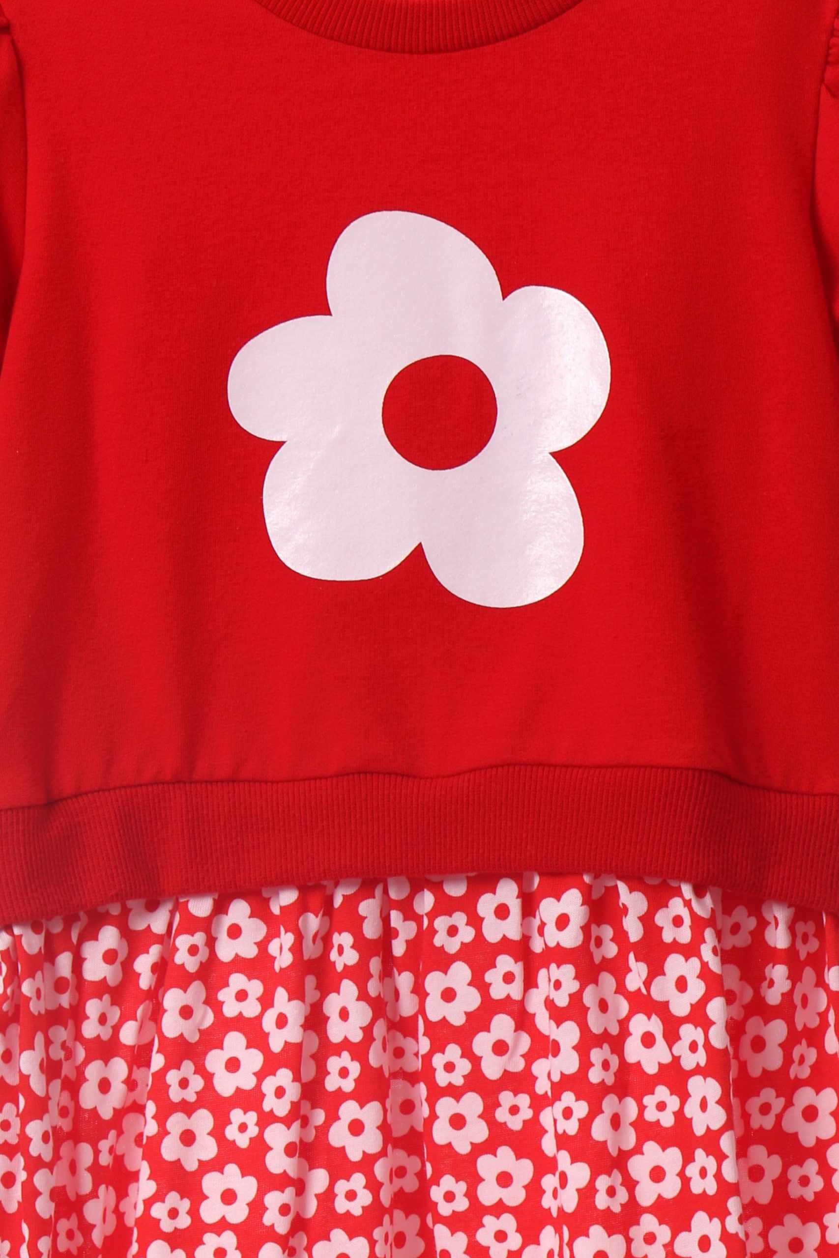 Red round-neck, short-sleeved dress with a white flower and a white floral print skirt. HAVANA collection. Sizes range from 04 to 14. Machine wash at a maximum of 30°C. Short spin cycle. Do not bleach. Iron at a maximum of 150°C. Do not dry clean. Do not tumble dry. Composition: 96% COTTON, 4% SPANDEX.
