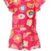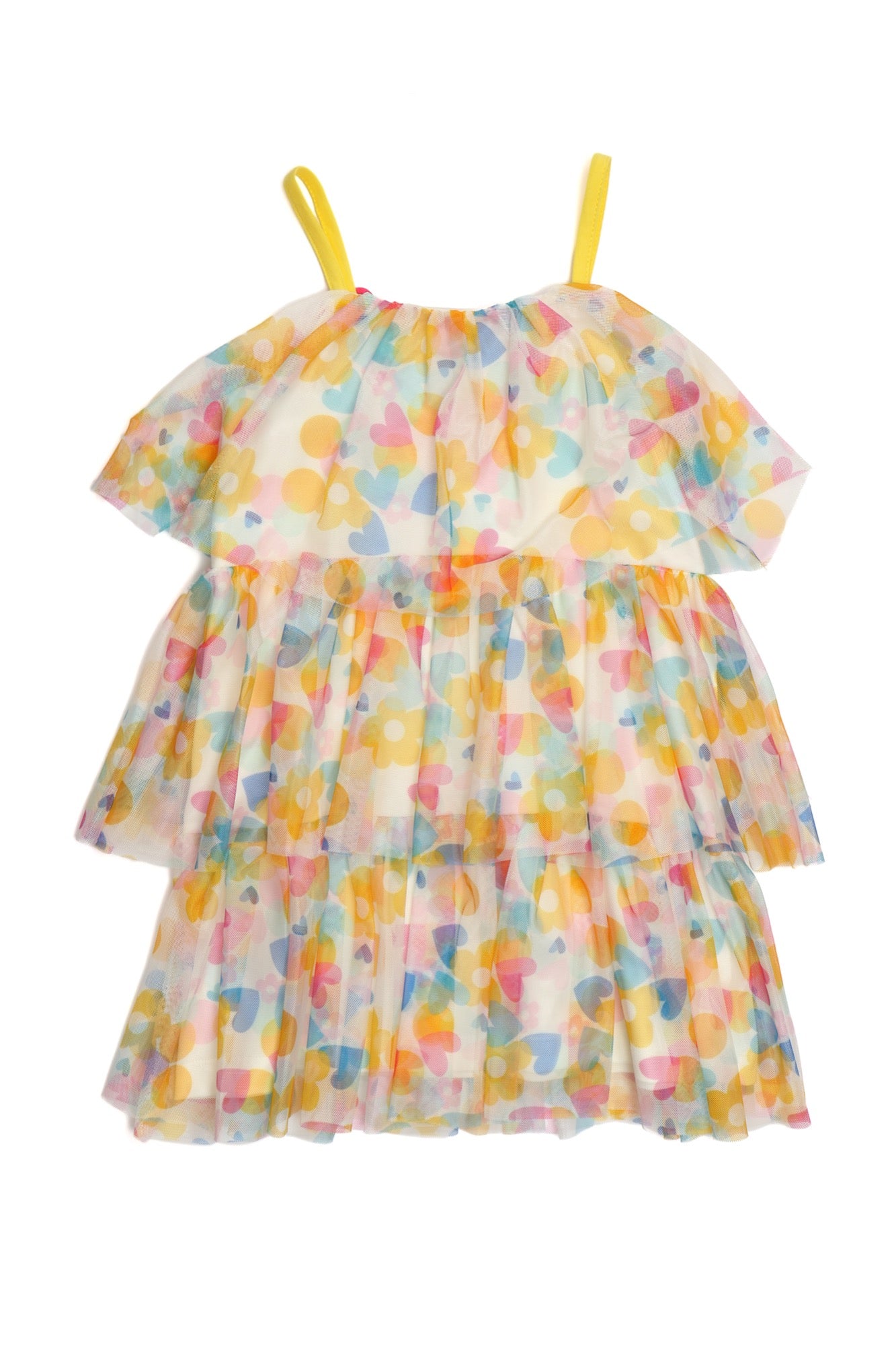 White strapless dress with fuchsia floral print and colorful hearts. MONACO collection. Sizes range from 04 to 14. Machine wash at a maximum of 30°C. Short spin cycle. Do not bleach. Iron at a maximum of 150°C. Do not dry clean. Do not tumble dry. Composition: 100% COTTON and 100% PES.