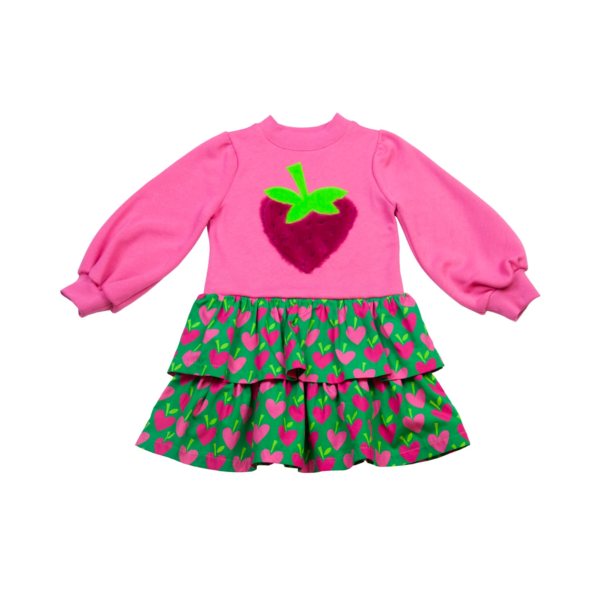 Pink round-neck, long-sleeved dress with a strawberry in the center, and a strawberry-print skirt on a green background. STRAWBERRY collection. Sizes from 04 to 14. Machine wash at a maximum of 30°C. Short spin cycle. Do not bleach. Iron at a maximum of 150°C. Do not dry clean. Do not tumble dry. Composition: 66% CO 34% PES 100% CO