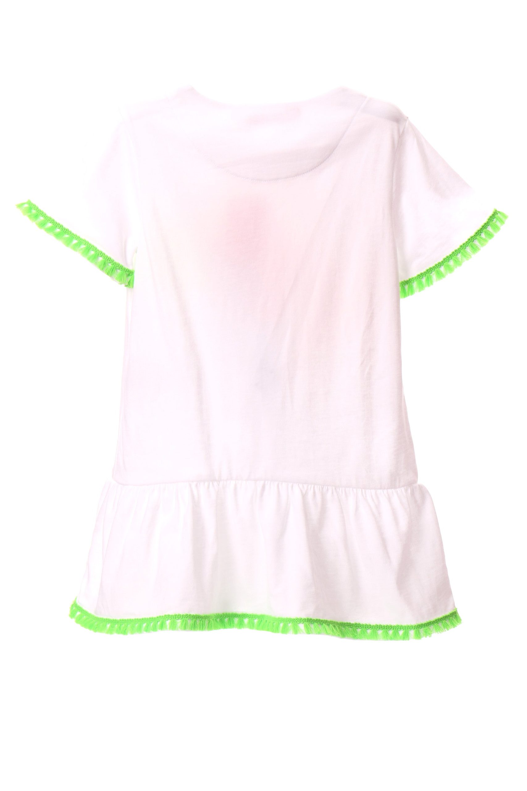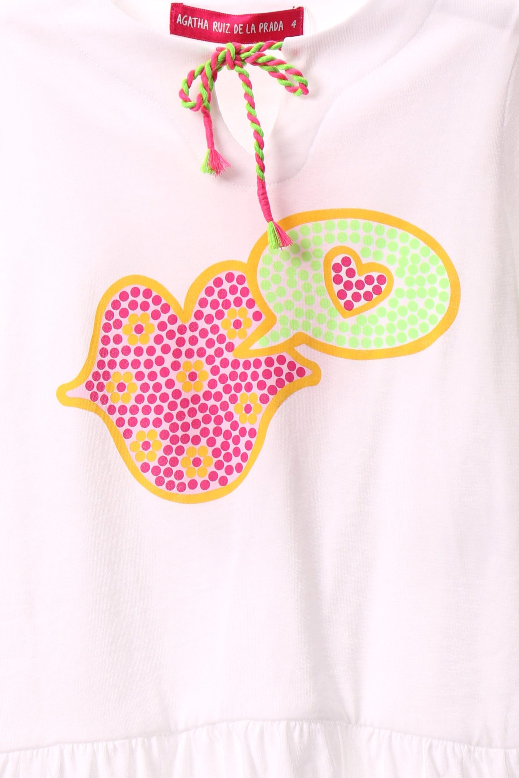 Short-sleeved white dress with a fuchsia kiss print and floral accents. GUADALAJARA Collection. Sizes range from 04 to 14. Machine wash at a maximum of 30°C. Short spin cycle. Do not bleach. Iron at a maximum of 150°C. Do not dry clean. Do not tumble dry. Composition: 100% COTTON.
