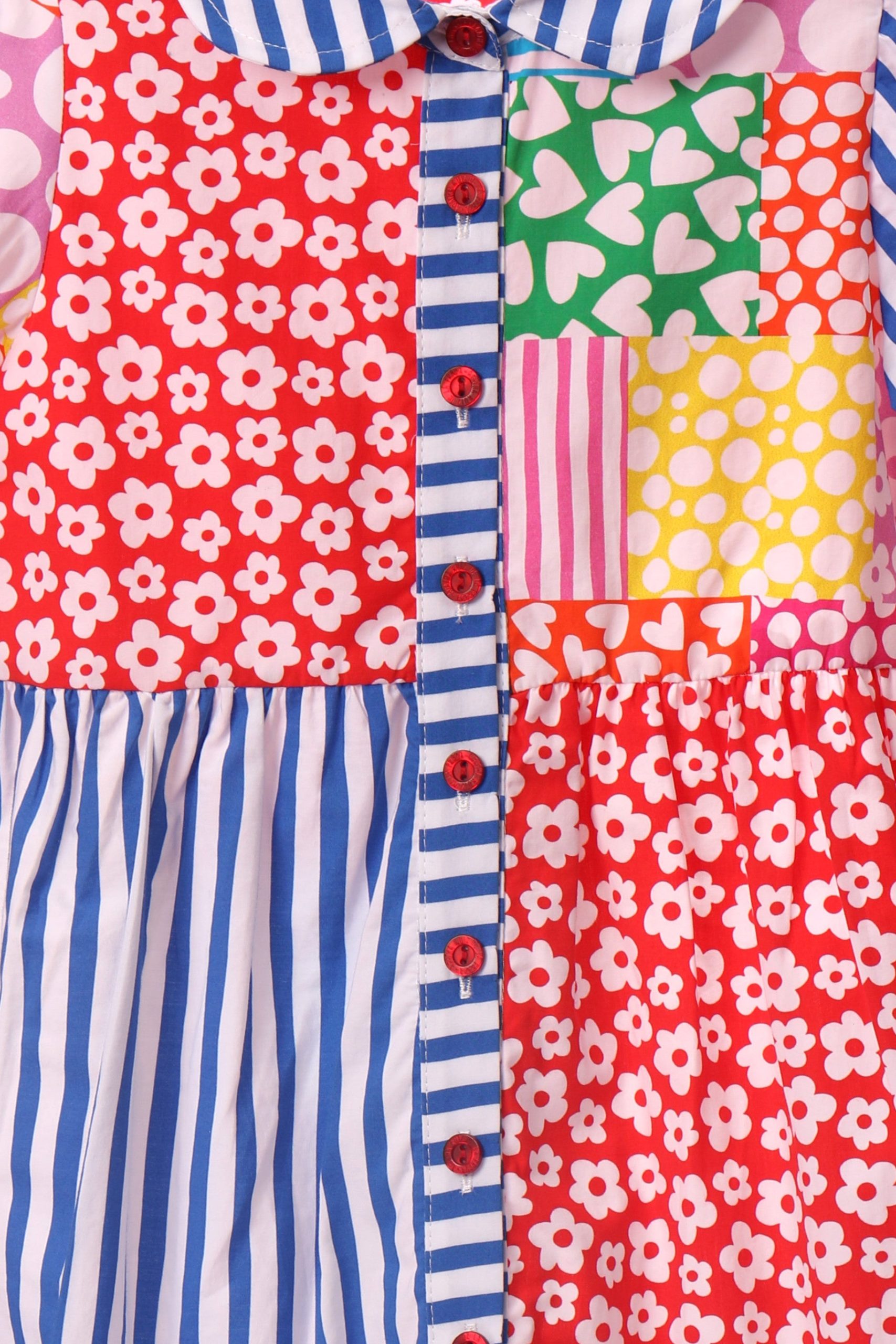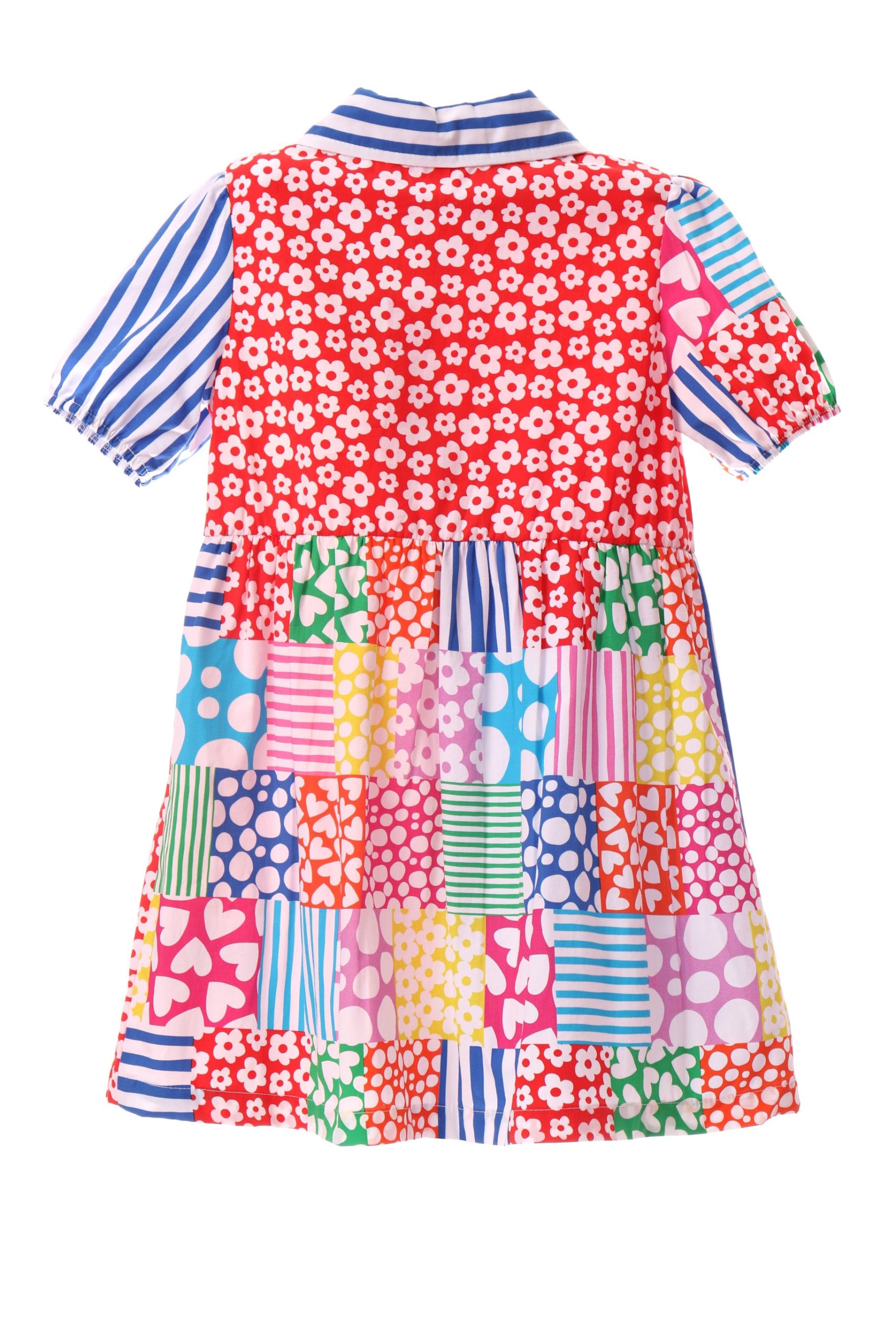 Round-neck, short-sleeved shirt dress with a colorful patchwork print and front button closure. COPENHAGEN collection. Sizes range from 04 to 14. Machine wash at a maximum of 30°C. Short spin cycle. Do not bleach. Iron at a maximum of 150°C. Do not dry clean. Do not tumble dry. Composition: 100% COTTON.