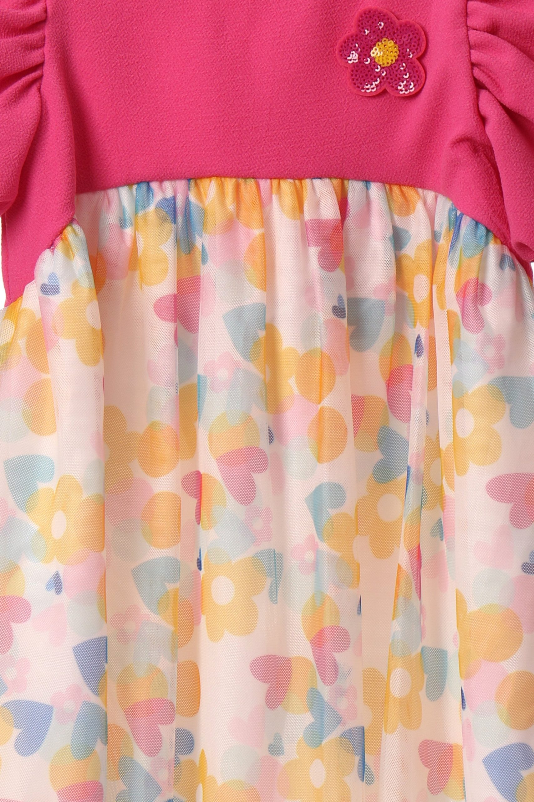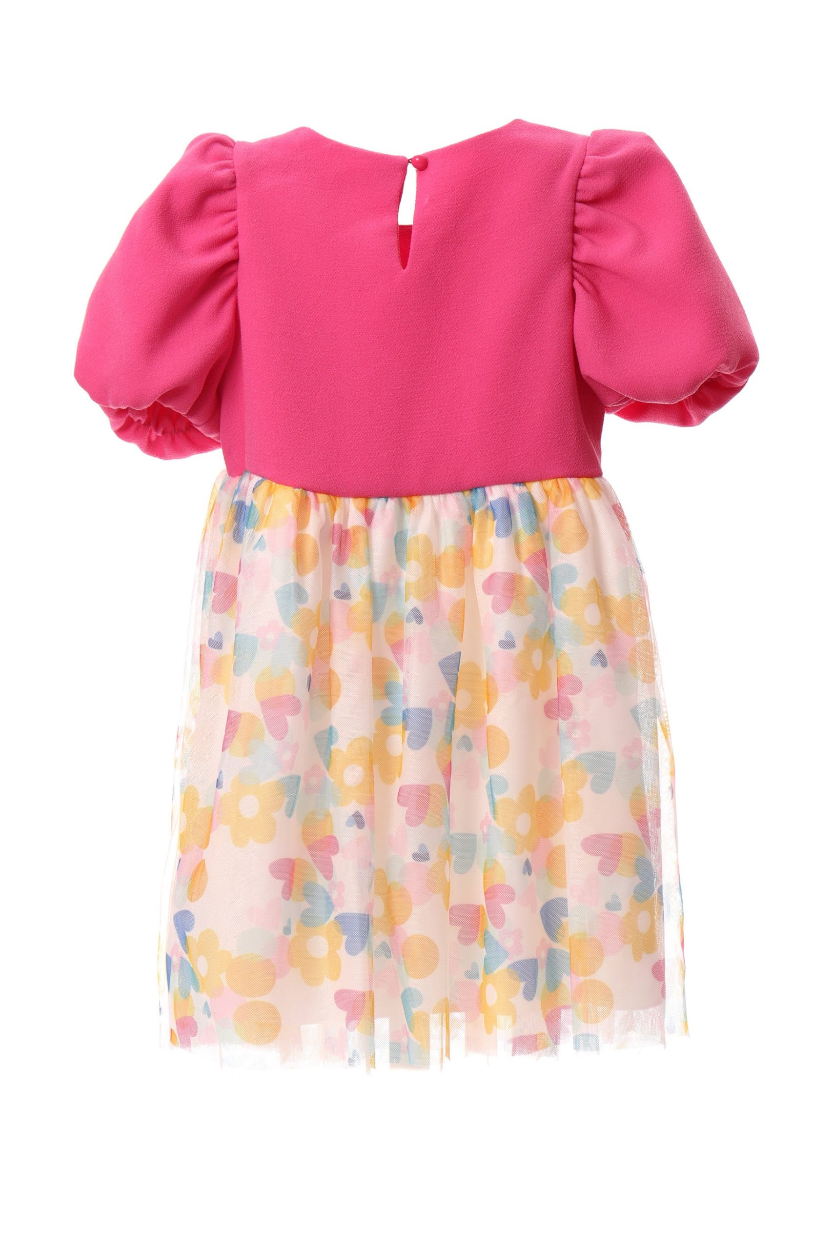 Fuchsia dress with a round neck and short puffed sleeves, featuring a white skirt printed with colorful hearts. MONACO collection. Sizes range from 04 to 14. Machine wash at a maximum of 30°C. Short spin cycle. Do not bleach. Iron at a maximum of 150°C. Do not dry clean. Do not tumble dry. Composition: 100% COTTON.