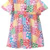 Fuchsia dress with a round neck and short puffed sleeves, featuring a white skirt printed with colorful hearts. MONACO collection. Sizes range from 04 to 14. Machine wash at a maximum of 30°C. Short spin cycle. Do not bleach. Iron at a maximum of 150°C. Do not dry clean. Do not tumble dry. Composition: 100% COTTON.