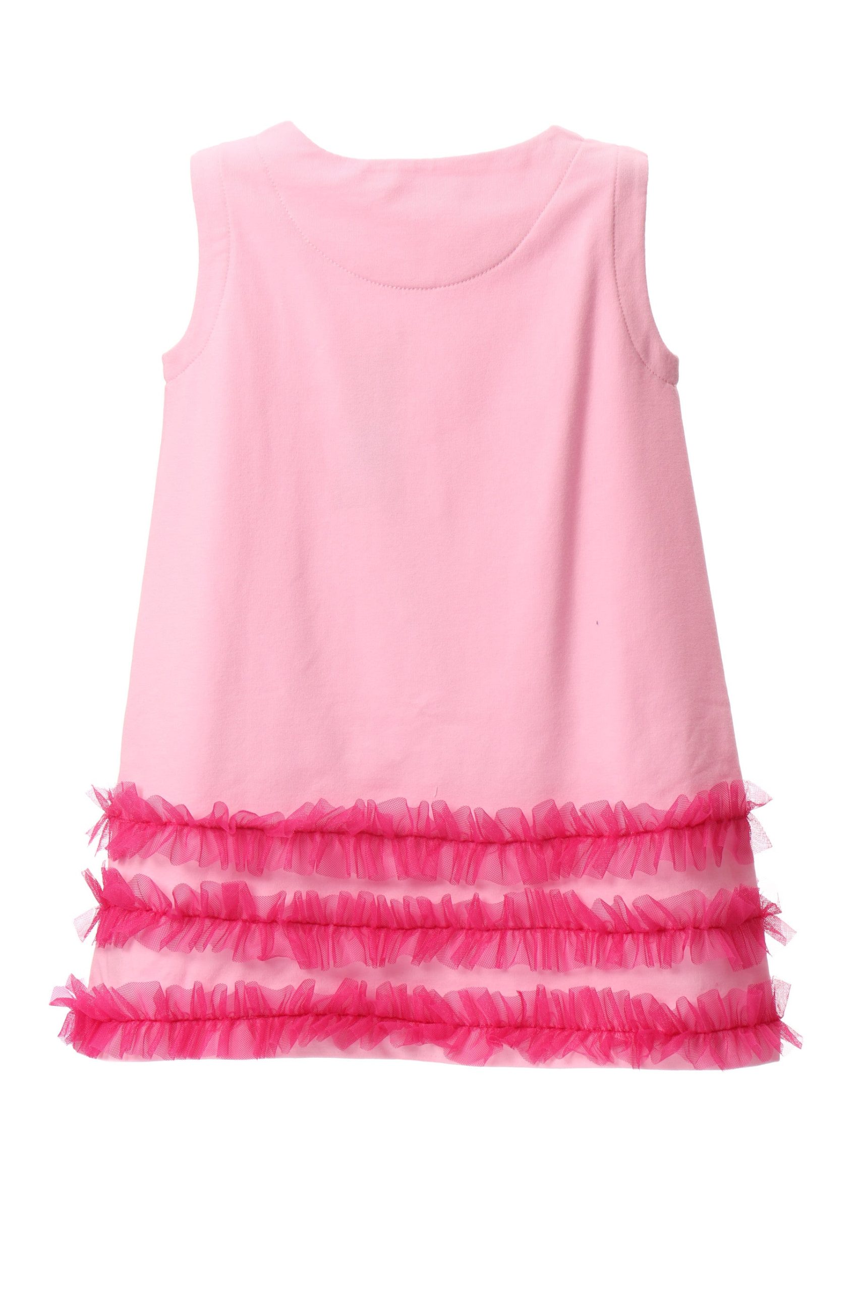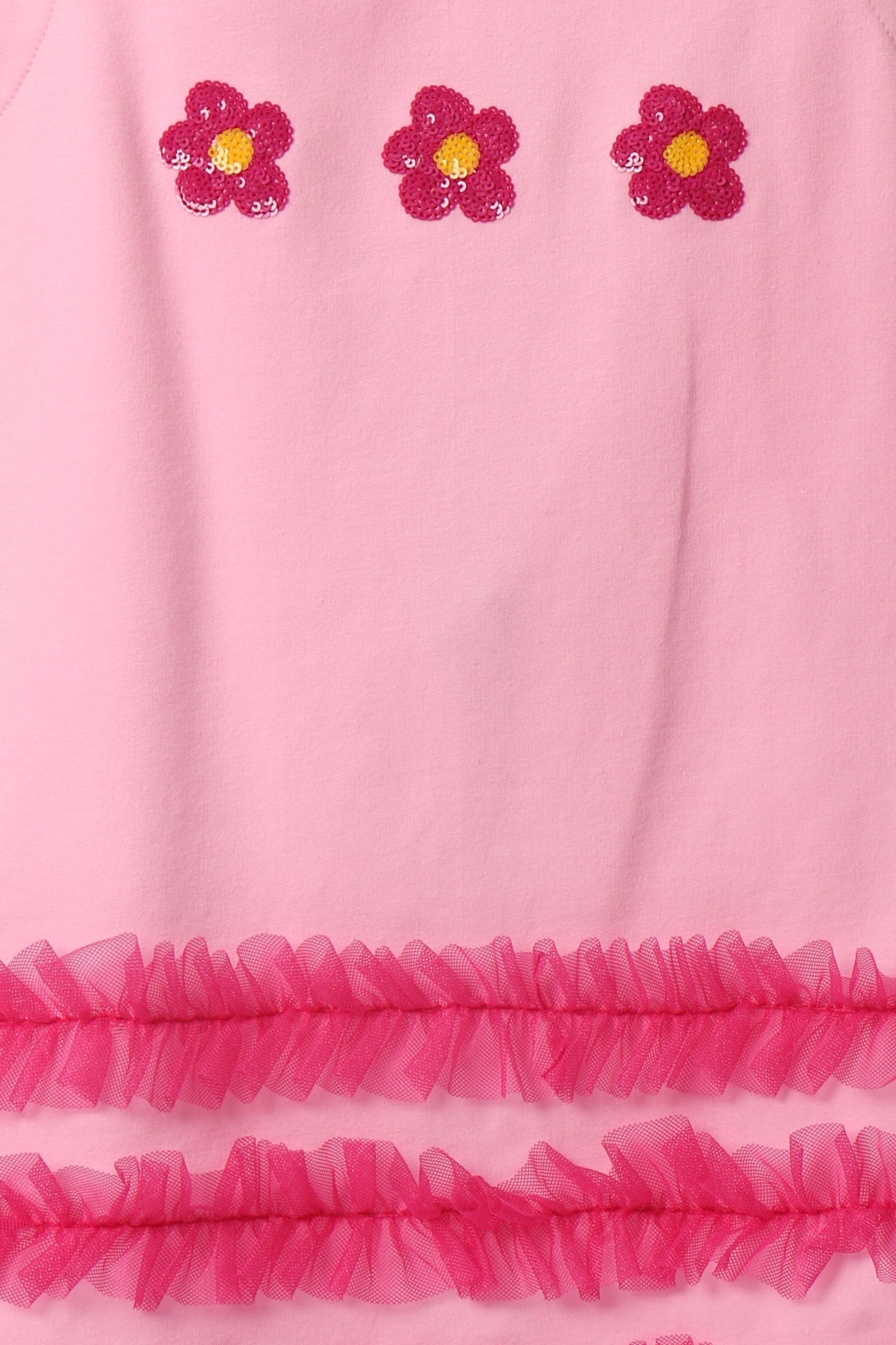 Sleeveless pink dress with three fuchsia flowers and embellishments at the bottom. MONACO collection. Sizes range from 04 to 14. Machine wash at a maximum of 30°C. Short spin cycle. Do not bleach. Iron at a maximum of 150°C. Do not dry clean. Do not tumble dry. Composition: 100% COTTON.