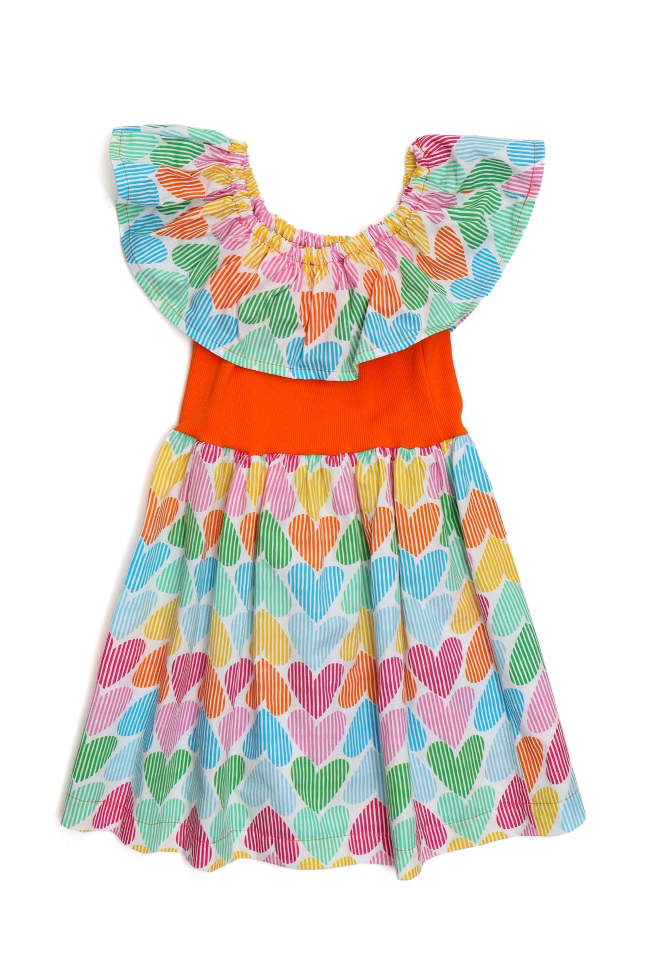 Sleeveless orange ribbed dress with a ruffled top and elastic sash. Skirt printed with striped hearts. NIZA collection. Sizes range from 04 to 14. Machine wash at a maximum of 30°C. Short spin cycle. Do not bleach. Iron at a maximum of 150°C. Do not dry clean. Do not tumble dry. Composition: 97% COTTON, 3% SPANDEX.
