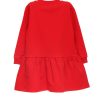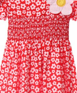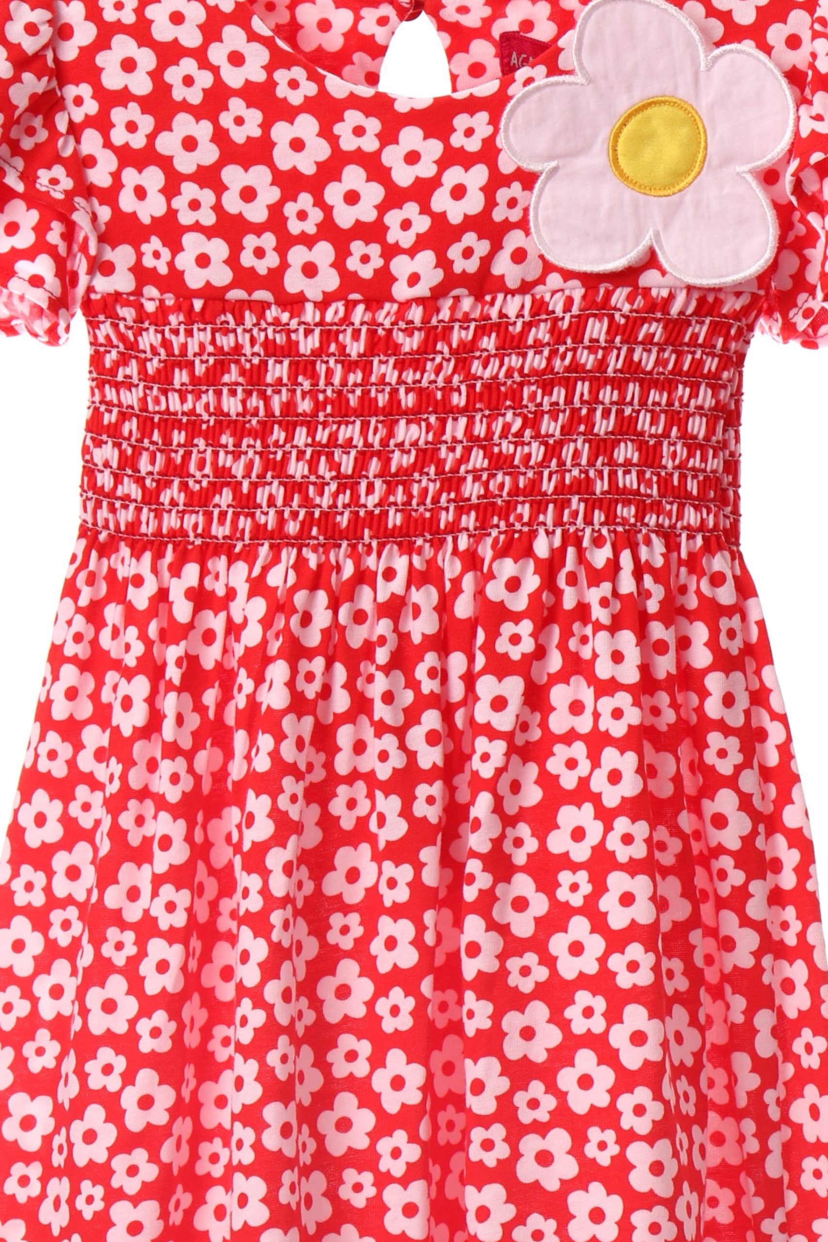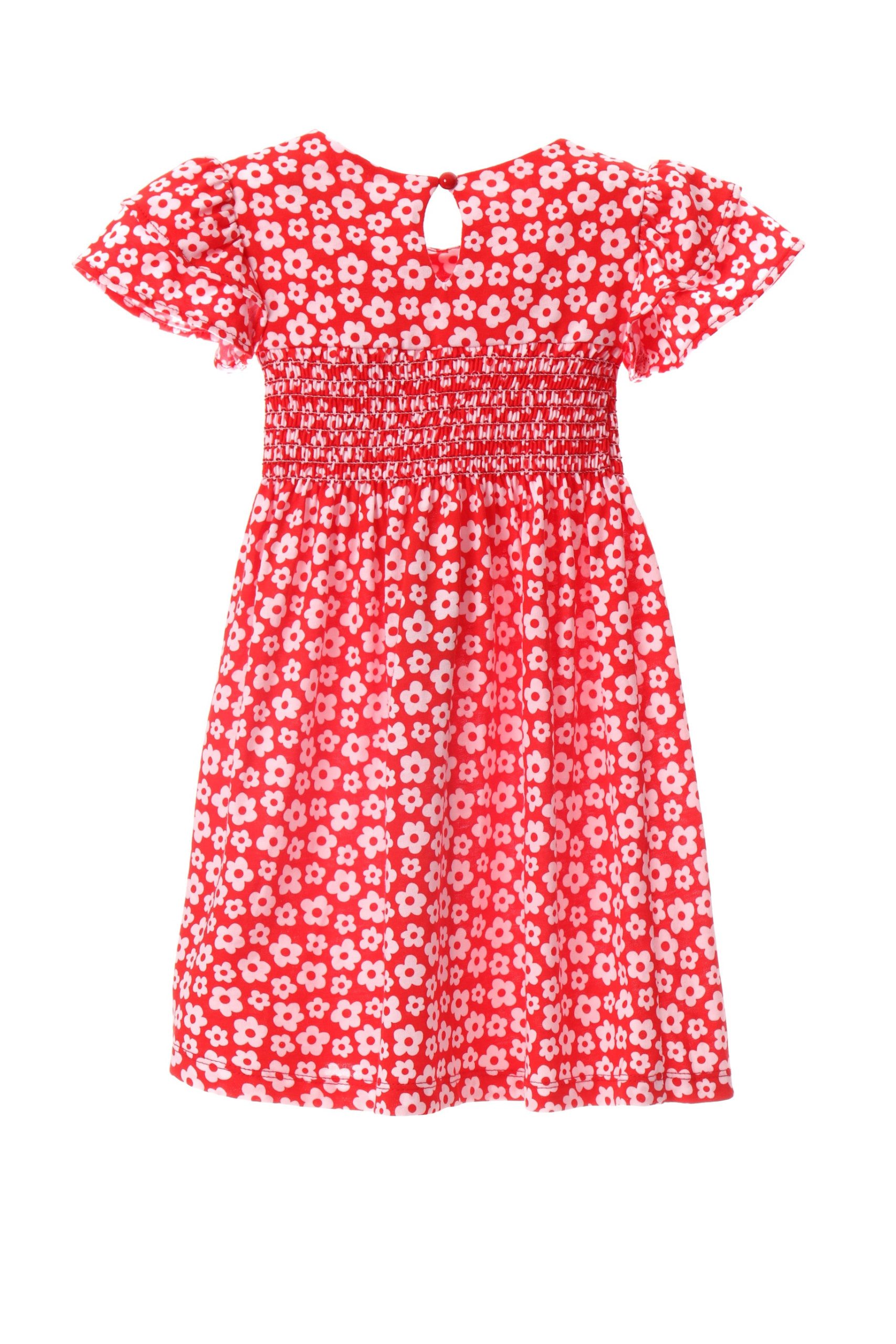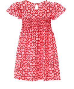 Round-neck dress with short sleeves and a cutout below the bust, featuring a white floral print on a red background. HAVANA collection. Sizes range from 04 to 14. Machine wash at a maximum of 30°C. Short spin cycle. Do not bleach. Iron at a maximum of 150°C. Do not dry clean. Do not tumble dry. Composition: 96% COTTON, 4% SPANDEX.