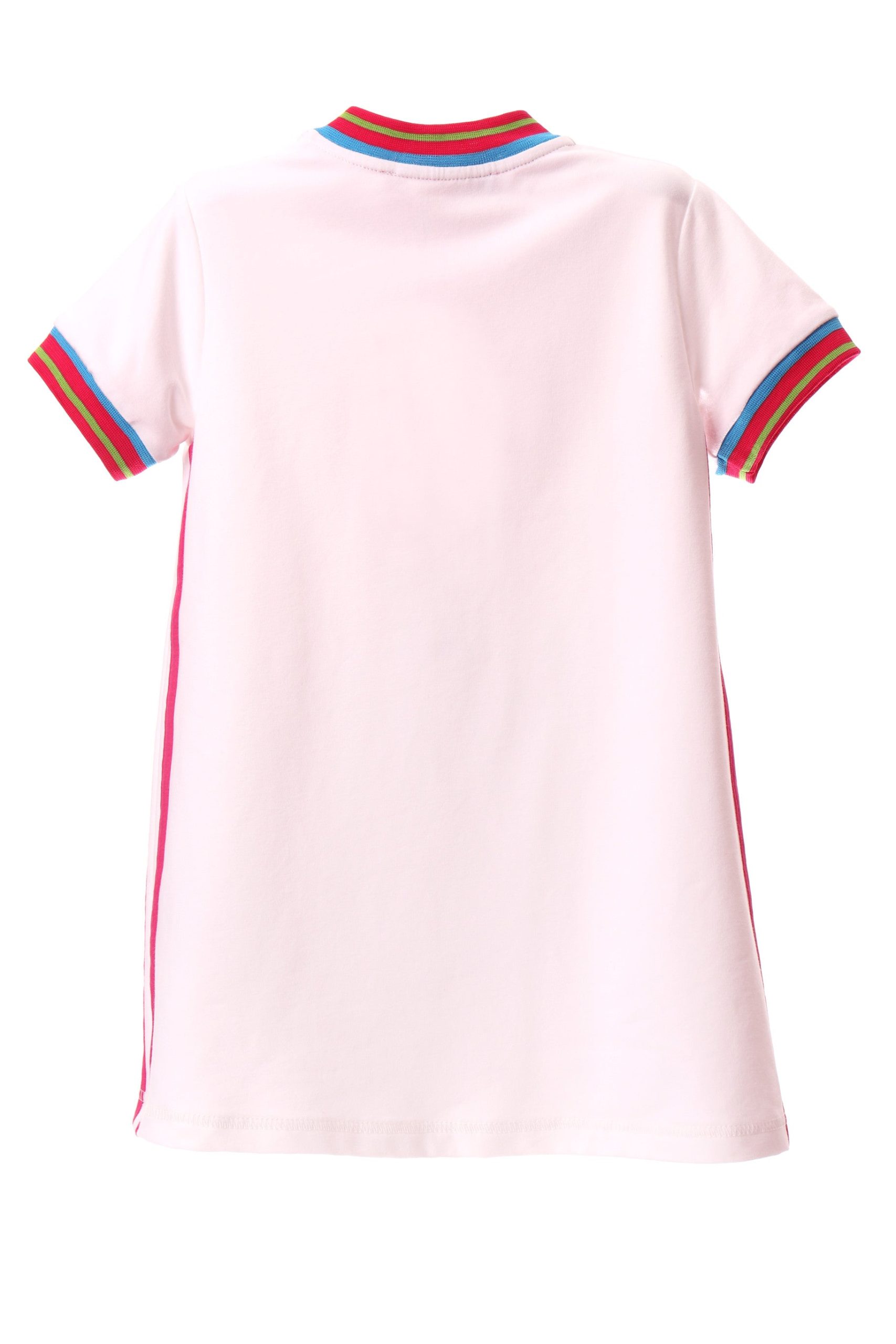 Short-sleeved white dress with a colorful print in the center and a zippered neckline. LISBOA collection. Sizes range from 04 to 14. Machine wash at a maximum of 30°C. Short spin cycle. Do not bleach. Iron at a maximum of 150°C. Do not dry clean. Do not tumble dry. Composition: 96% COTTON, 4% ELASTANE.
