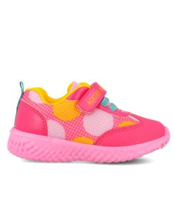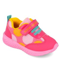 Multicolored mesh sneaker with colorful polka dots. Lightweight, with Velcro closure and elastic laces, and a pink sole. Reinforced toe and sides to prevent chafing. Sizes range from 22 to 30.
