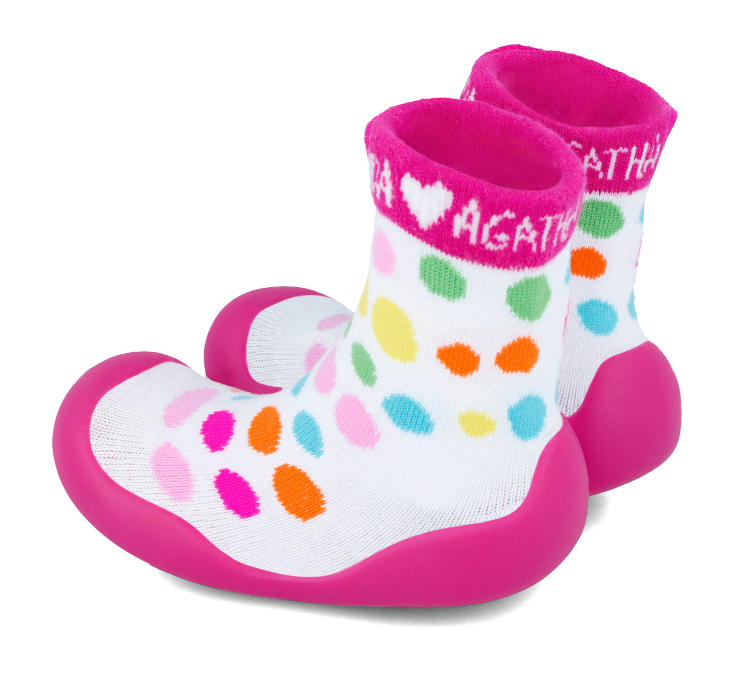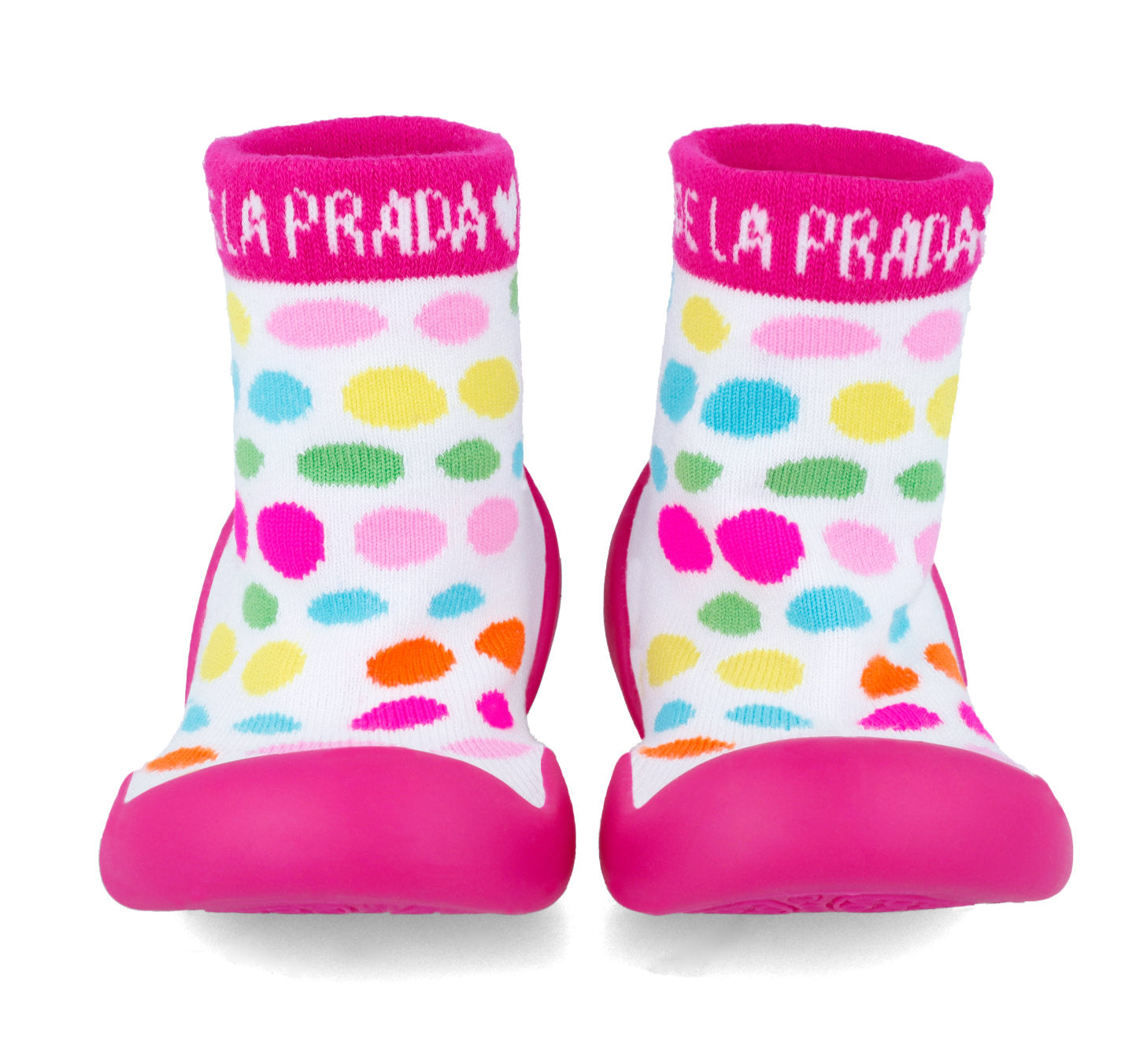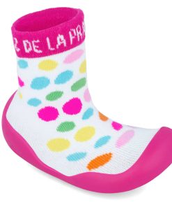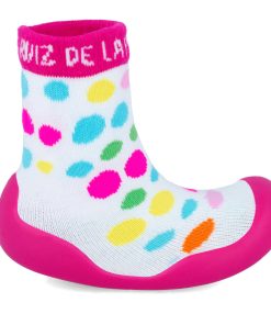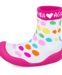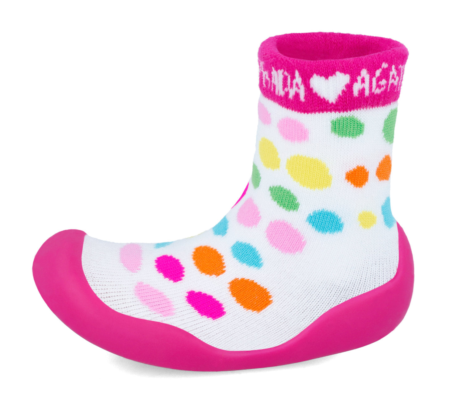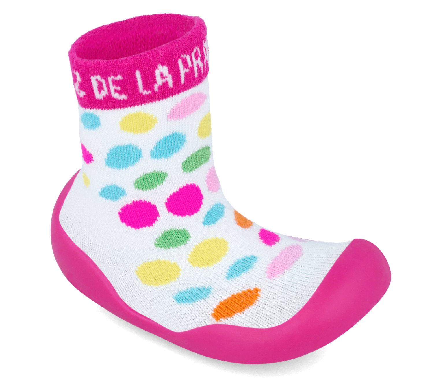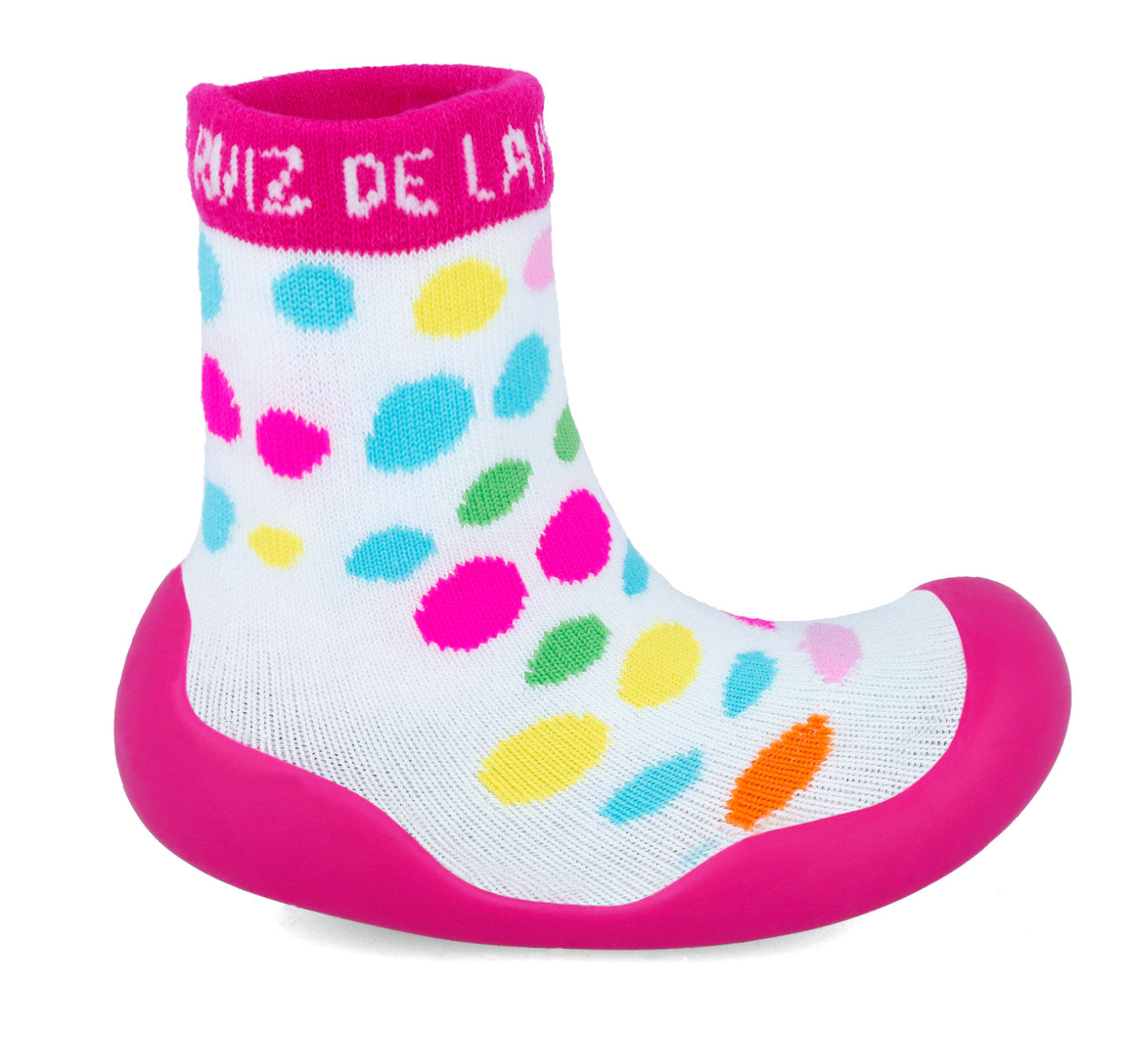 White lycra socks with colorful polka dots and a fuchsia sole. Flexible, with an antibacterial, non-slip, breathable insole and a wide toe box. Sizes range from 18 to 23.