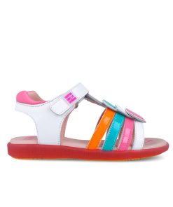 White leather sandals with colorful hearts. Velcro closure at the ankle and Velcro at the instep for adjustment. Fuchsia sole and yellow insole. Sizes from 24 to 34. Composition: 100% LEATHER and RUBBER Sole.