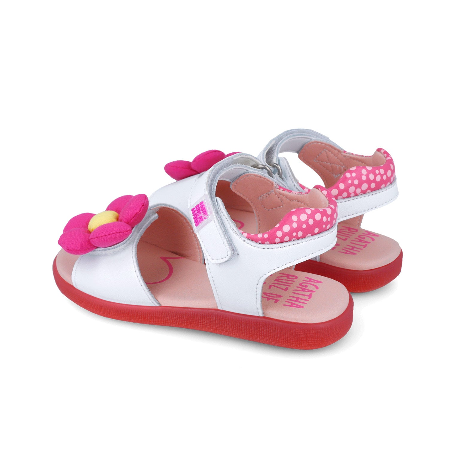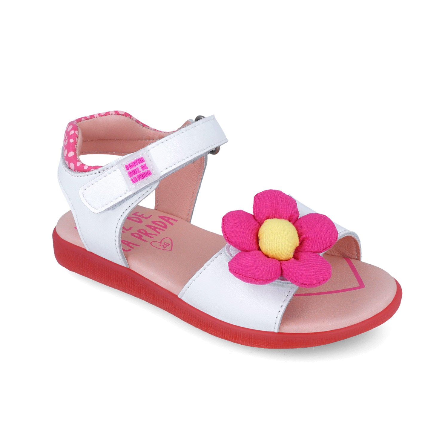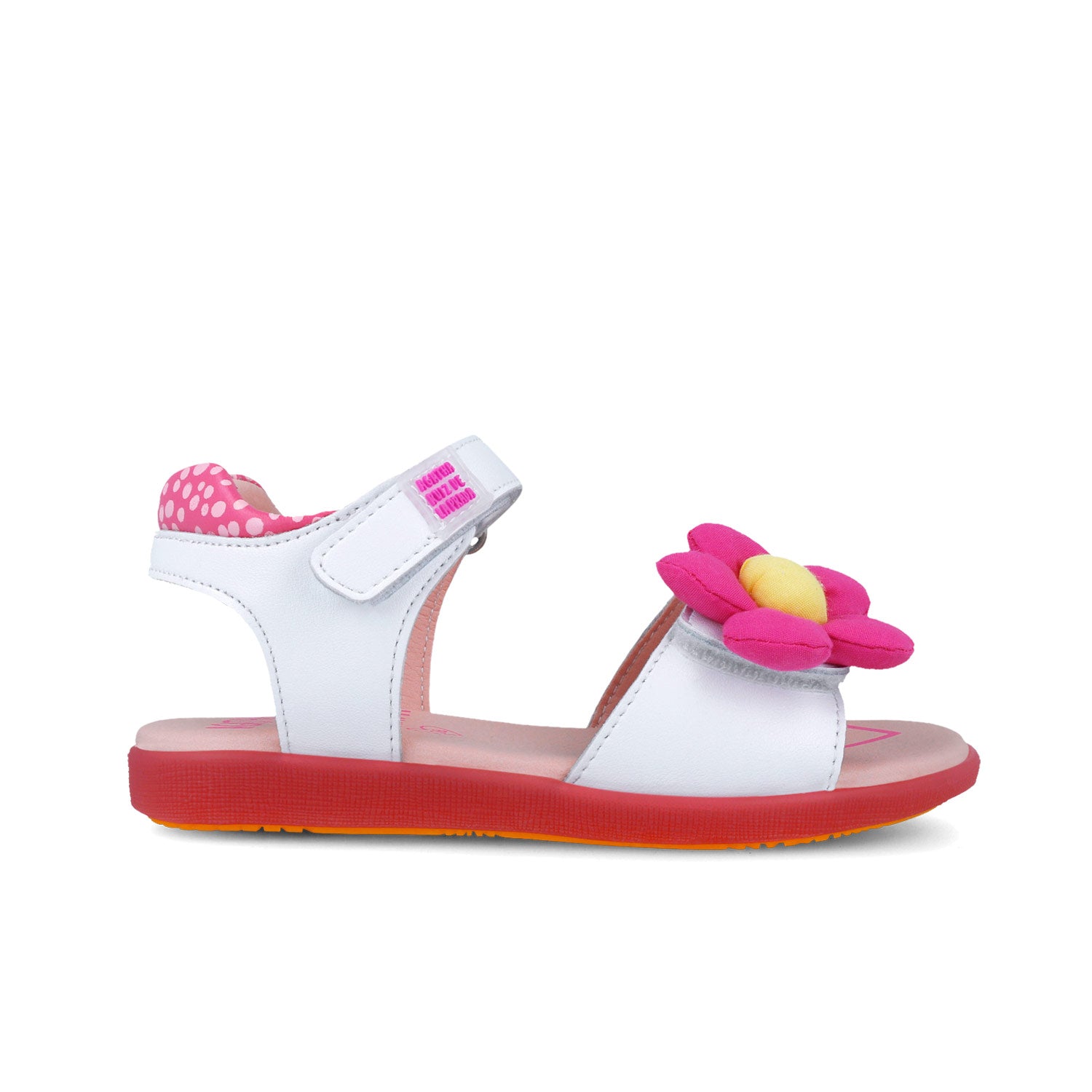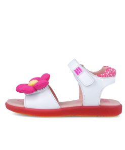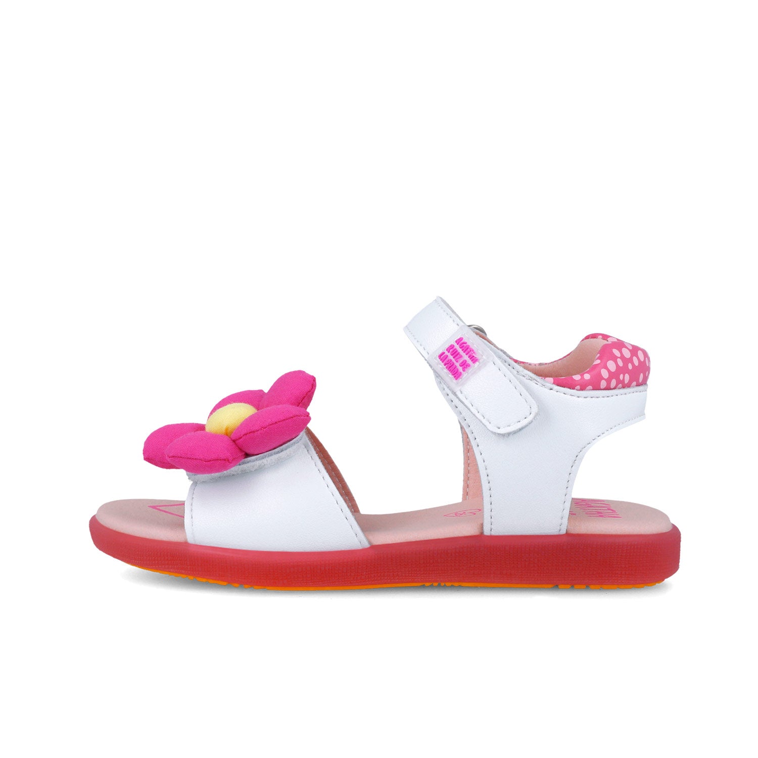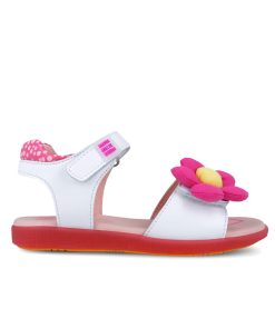 White leather sandals with a fuchsia flower. Velcro closure at the ankle and Velcro at the instep for adjustment. Fuchsia sole and yellow insole. Sizes from 24 to 34. Composition: 100% LEATHER and RUBBER Sole.