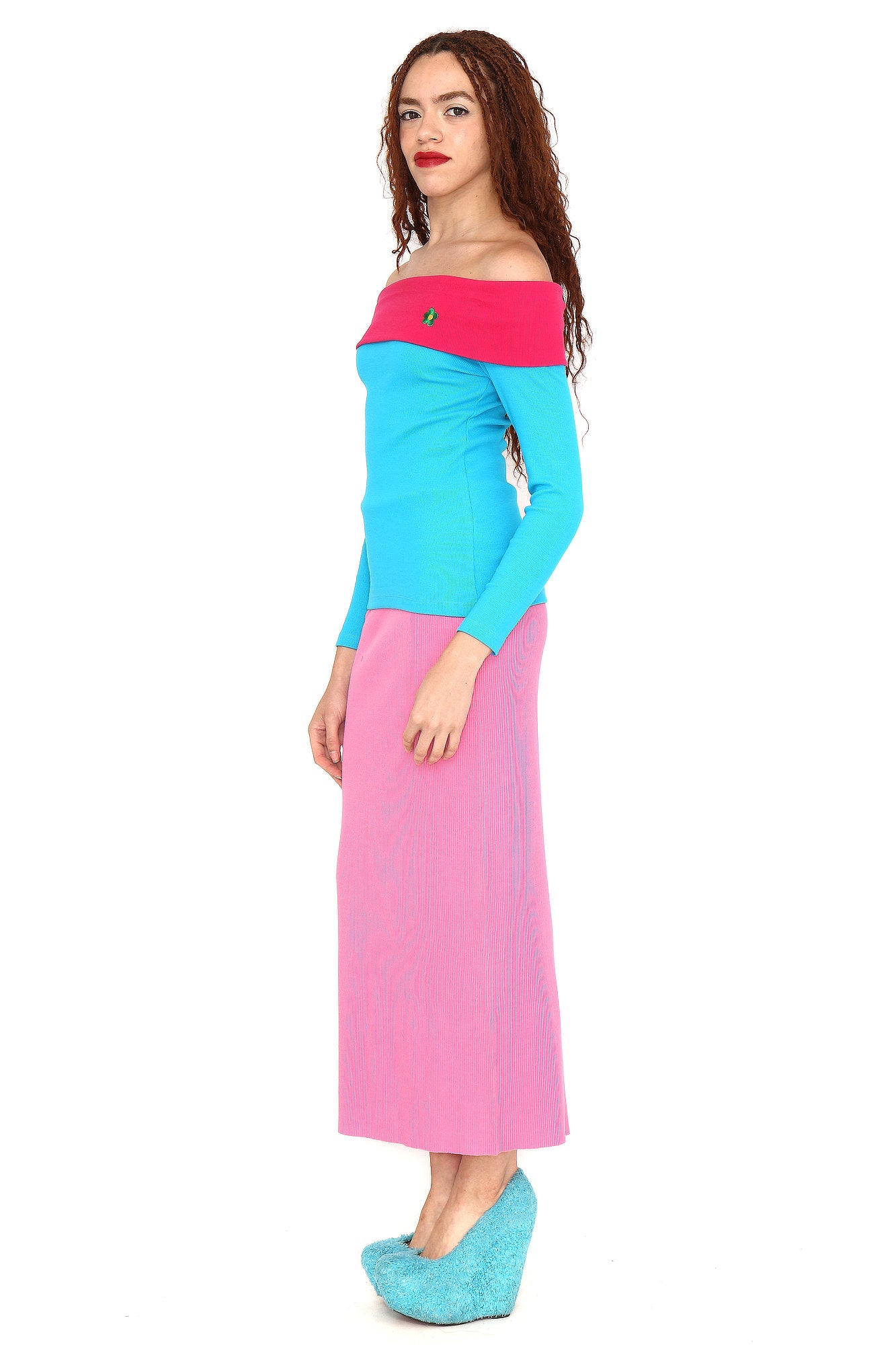 Turquoise blue long-sleeved T-shirt with a fuchsia boat neck. Regular fit. Sizes: 36 to 44. Model’s height: 173 cm. Photo size: 38. Machine wash max 30°C. Do not bleach. Do not tumble dry. Iron max 110°C. 96% COTTON 4% SPANDEX.