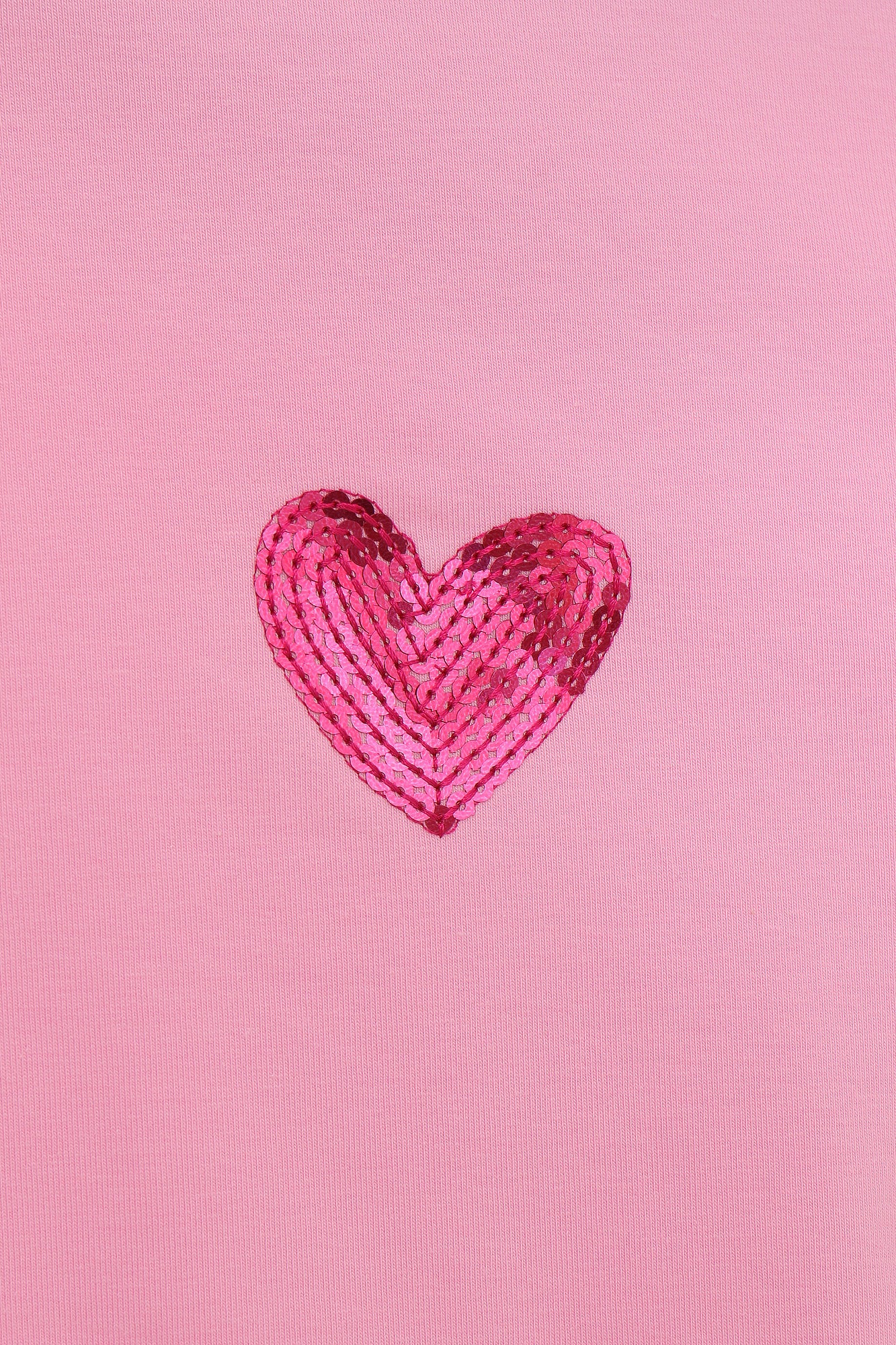 Long-sleeved pink turtleneck t-shirt with a fuchsia heart. Regular fit. Sizes: 36 to 44. Model’s height: 173 cm. Photo size: 38. Machine wash max 30°C. Do not bleach. Do not tumble dry. Iron max 110°C. 96% COTTON 4% SPANDEX.