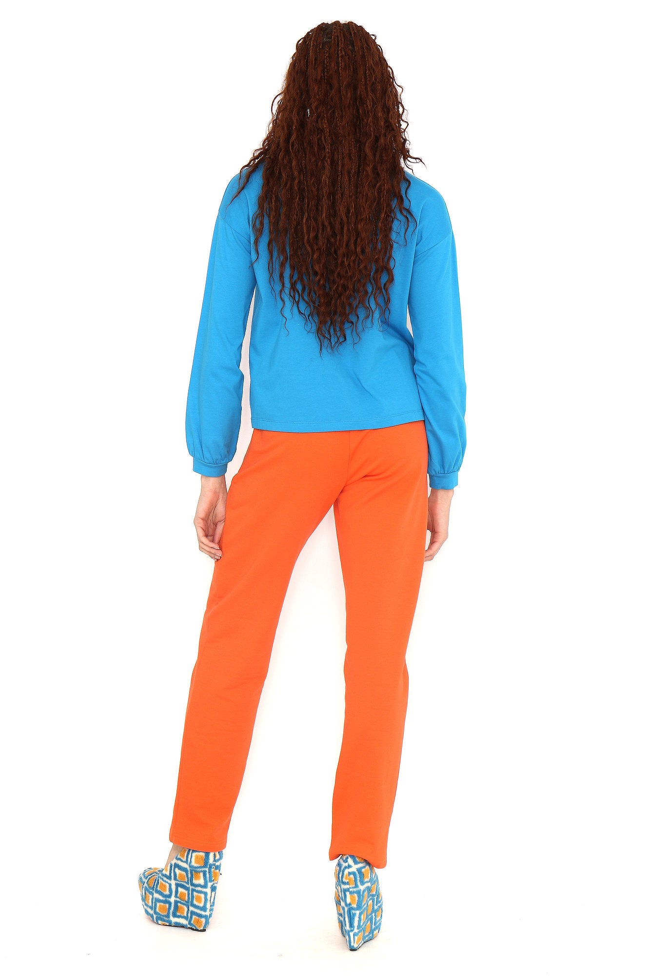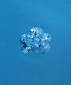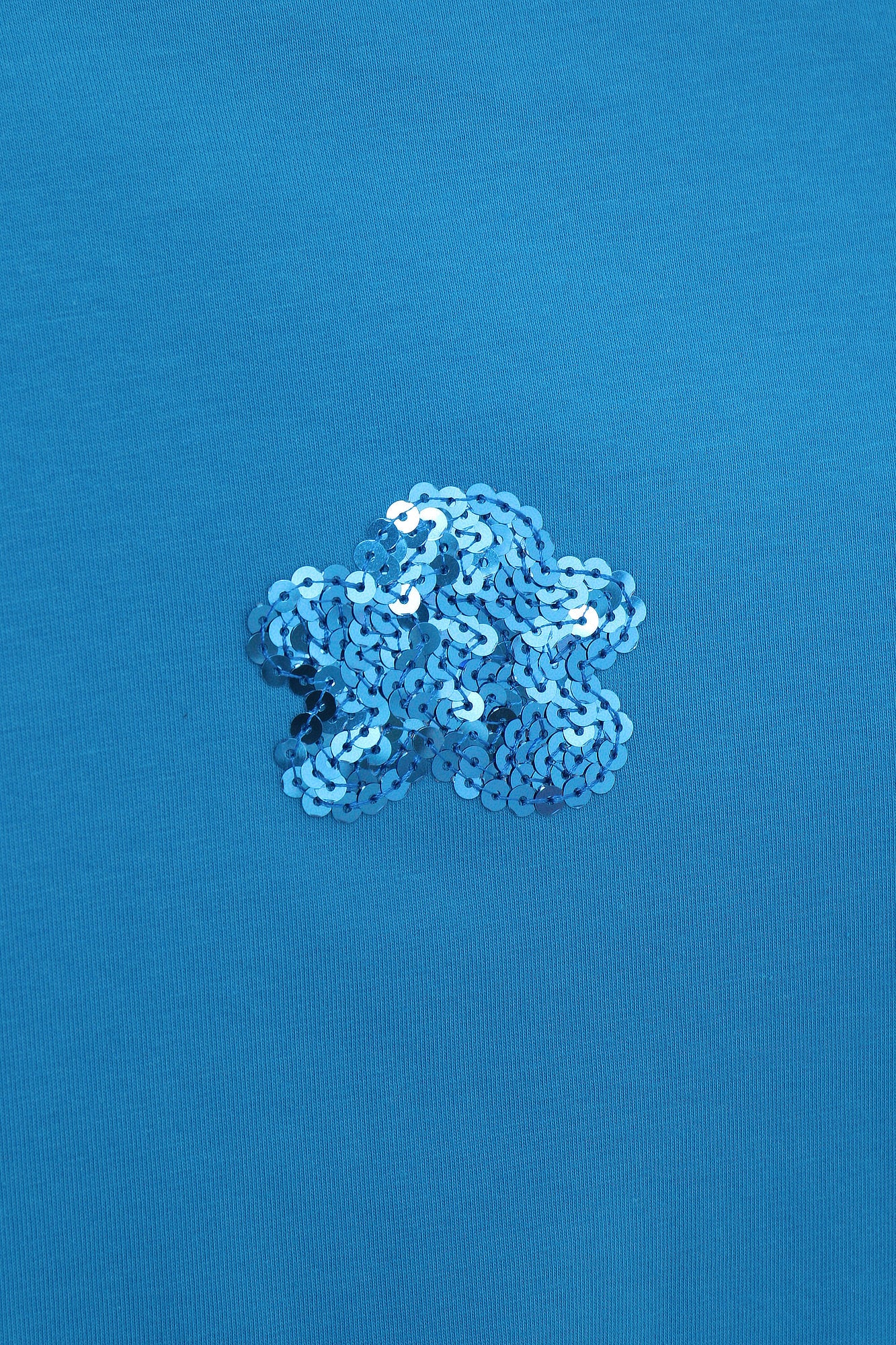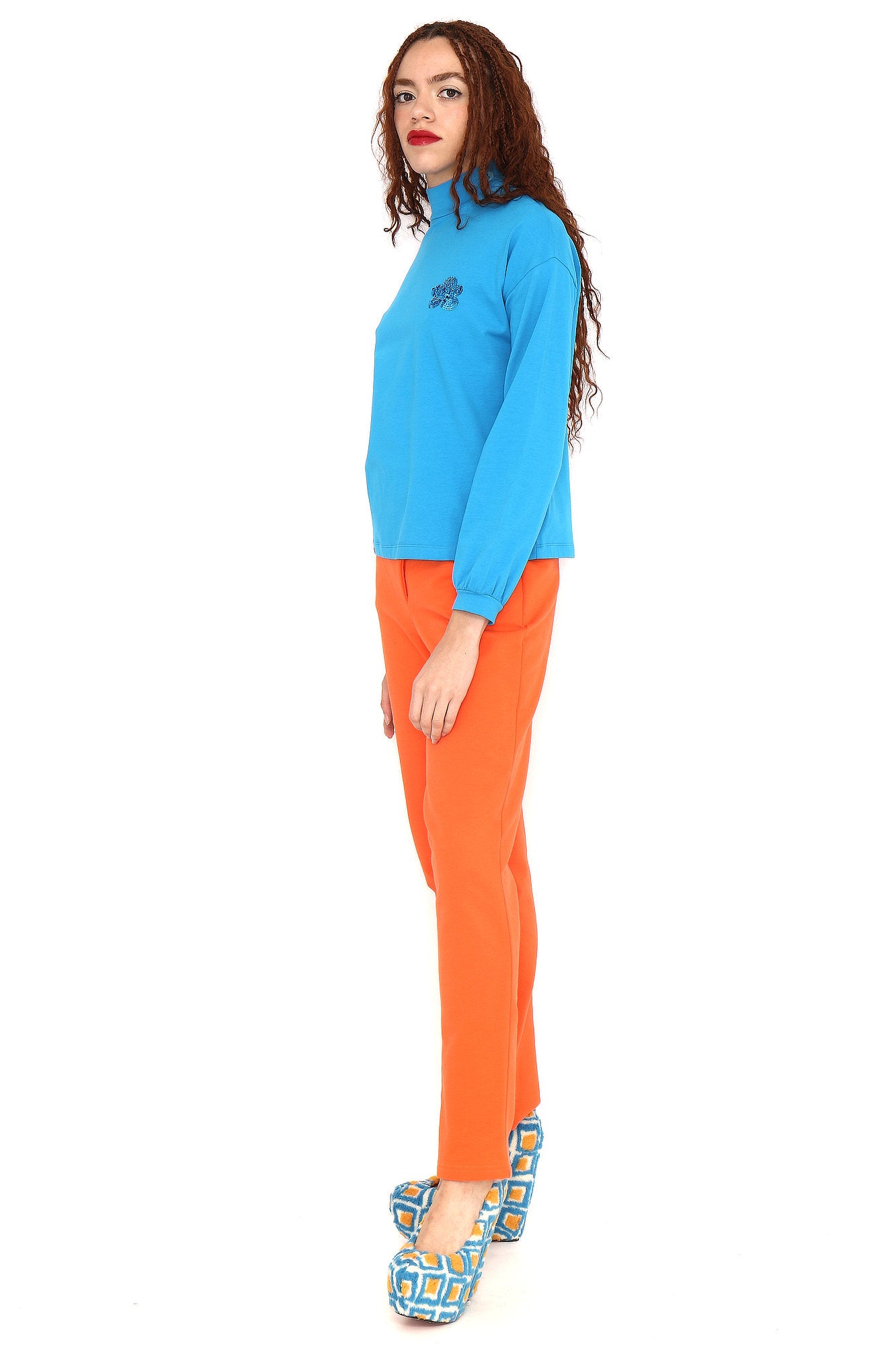 Long-sleeved blue turtleneck T-shirt with a white cloud print. True to size. Sizes: 36 to 44. Model’s height: 173 cm. Photo size: 38. Machine wash at a maximum temperature of 30°C. Do not bleach. Do not tumble dry. Iron at a maximum temperature of 110°C. 96% COTTON, 4% SPANDEX.