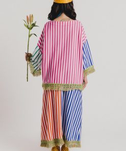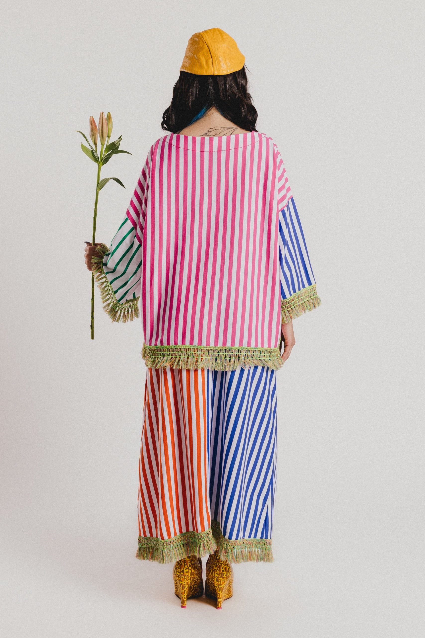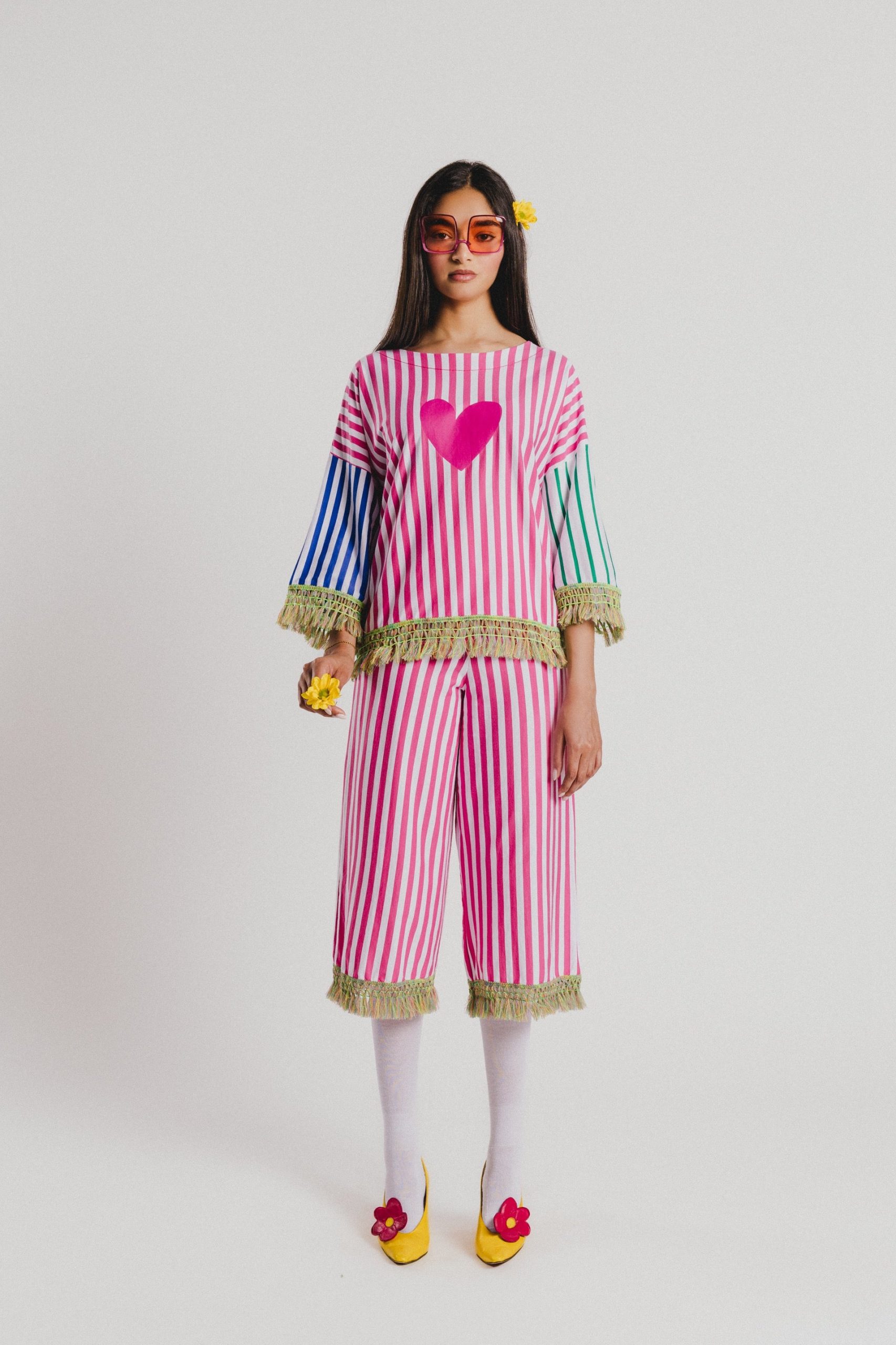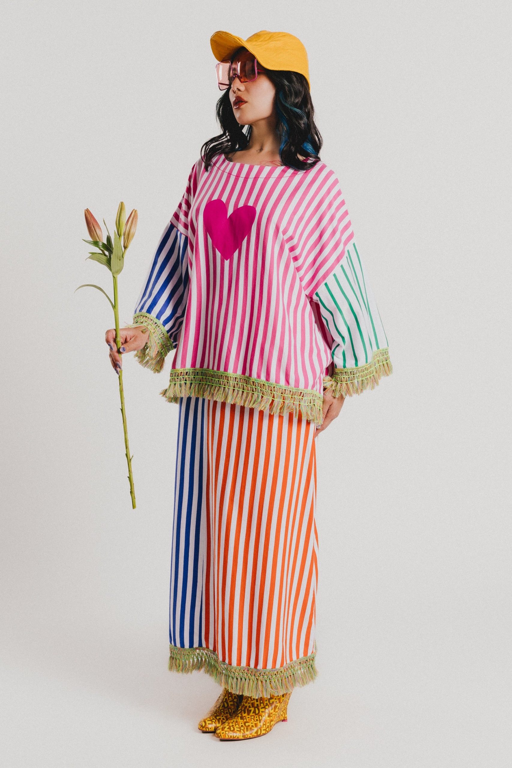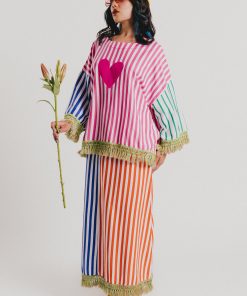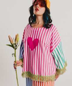 Colorful striped T-shirt with a heart in the center. Regular fit. Sizes: 36 to 44. Model’s height: 1’80 cm. Photo size: 38. Machine wash max 30°C. Do not bleach. Do not tumble dry. Iron max 110°C. 100% COTTON.