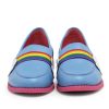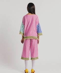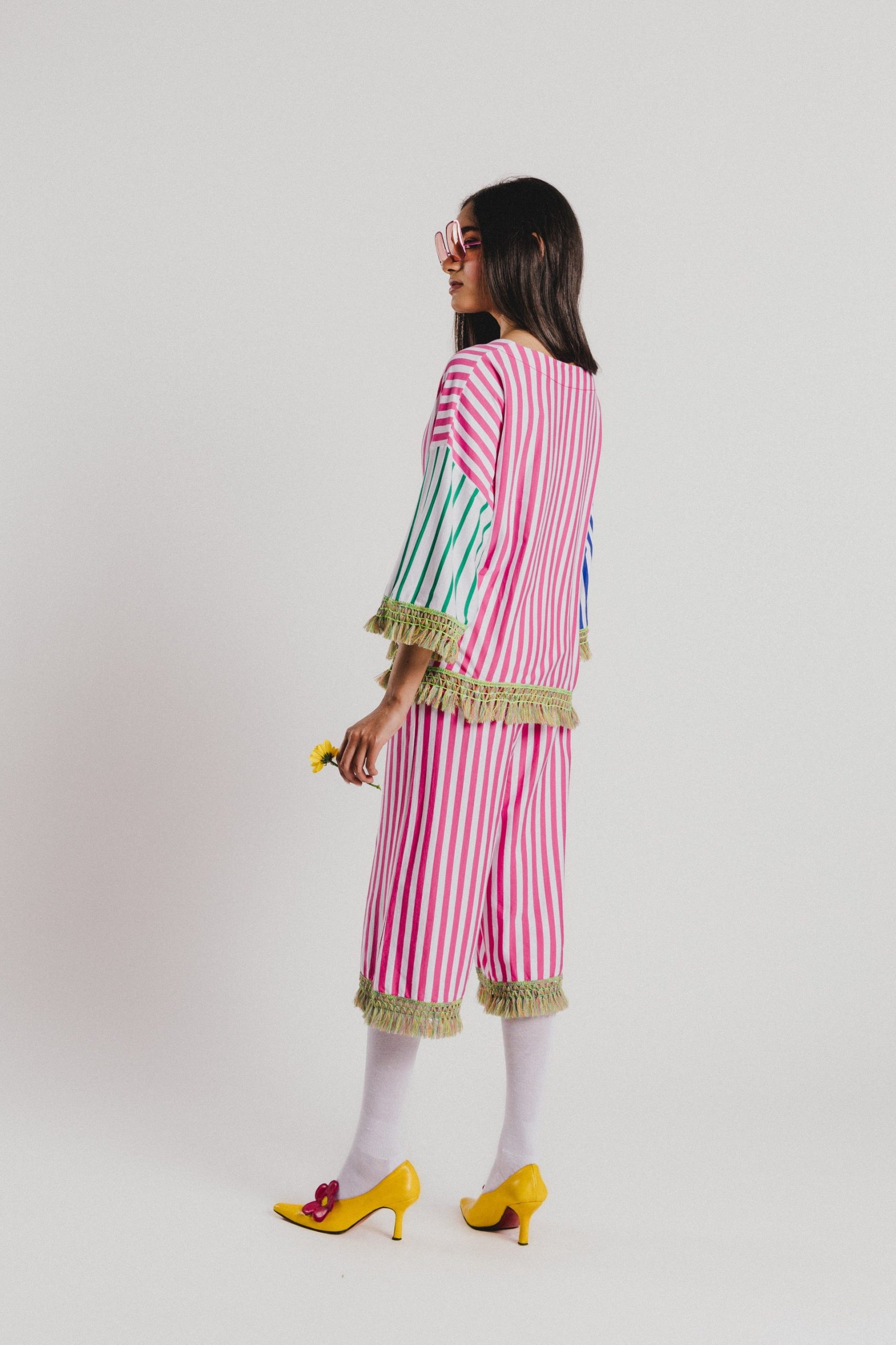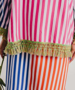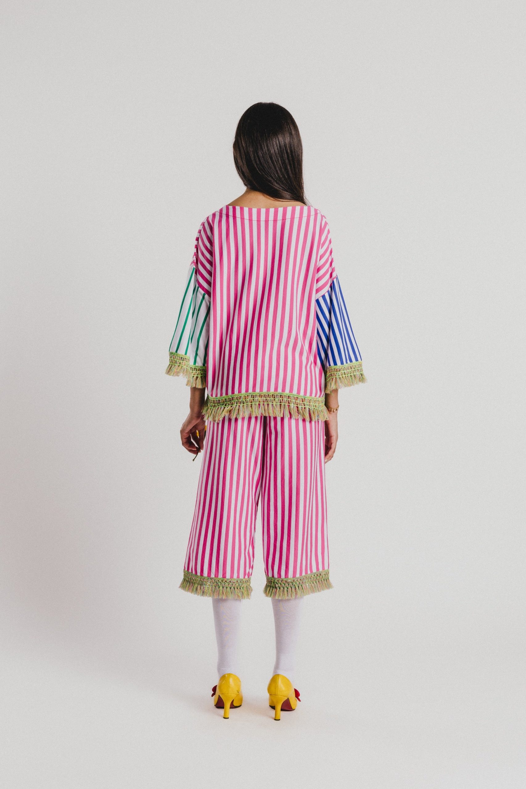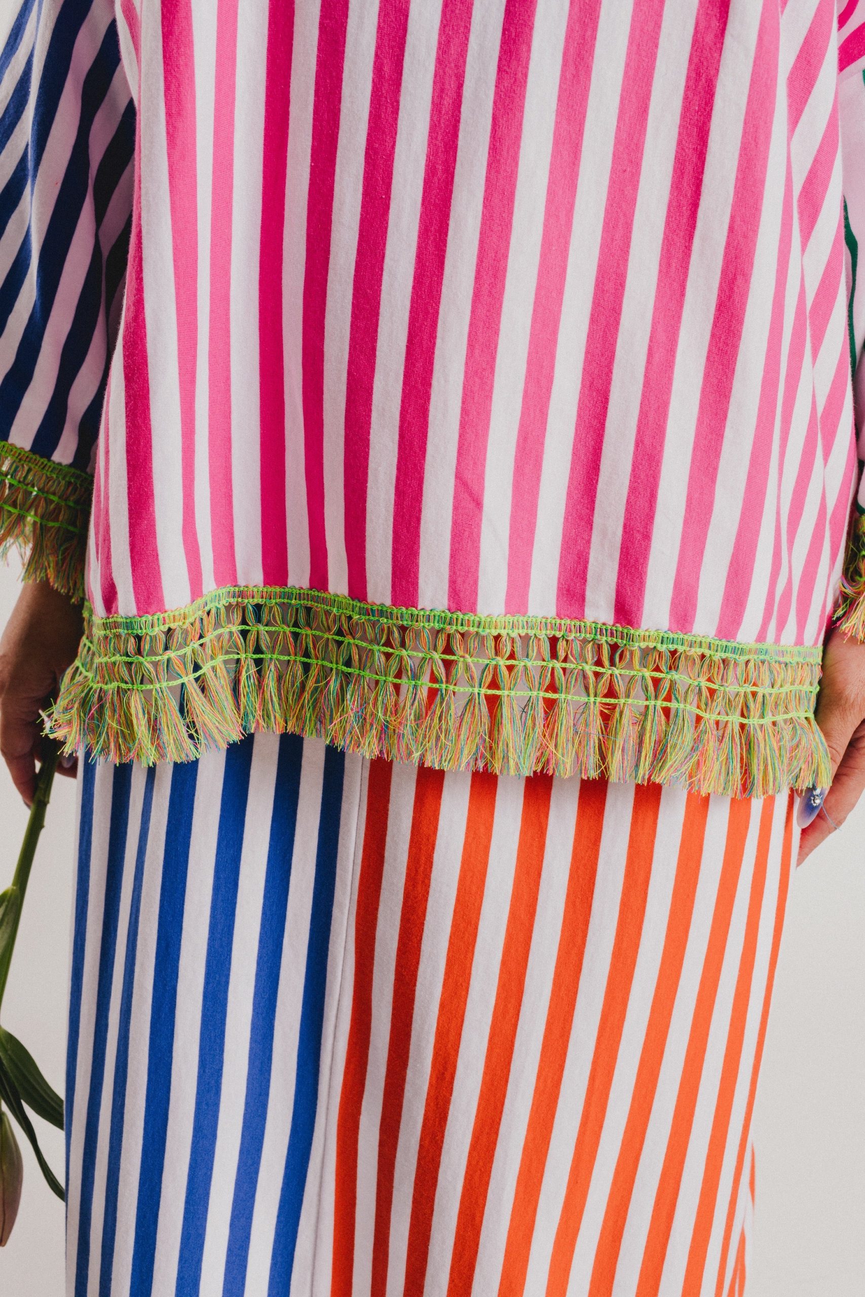 Colorful striped T-shirt with a heart in the center. Regular fit. Sizes: 36 to 44. Model’s height: 1’80 cm. Photo size: 38. Machine wash max 30°C. Do not bleach. Do not tumble dry. Iron max 110°C. 100% COTTON.