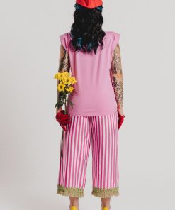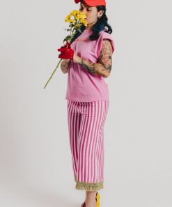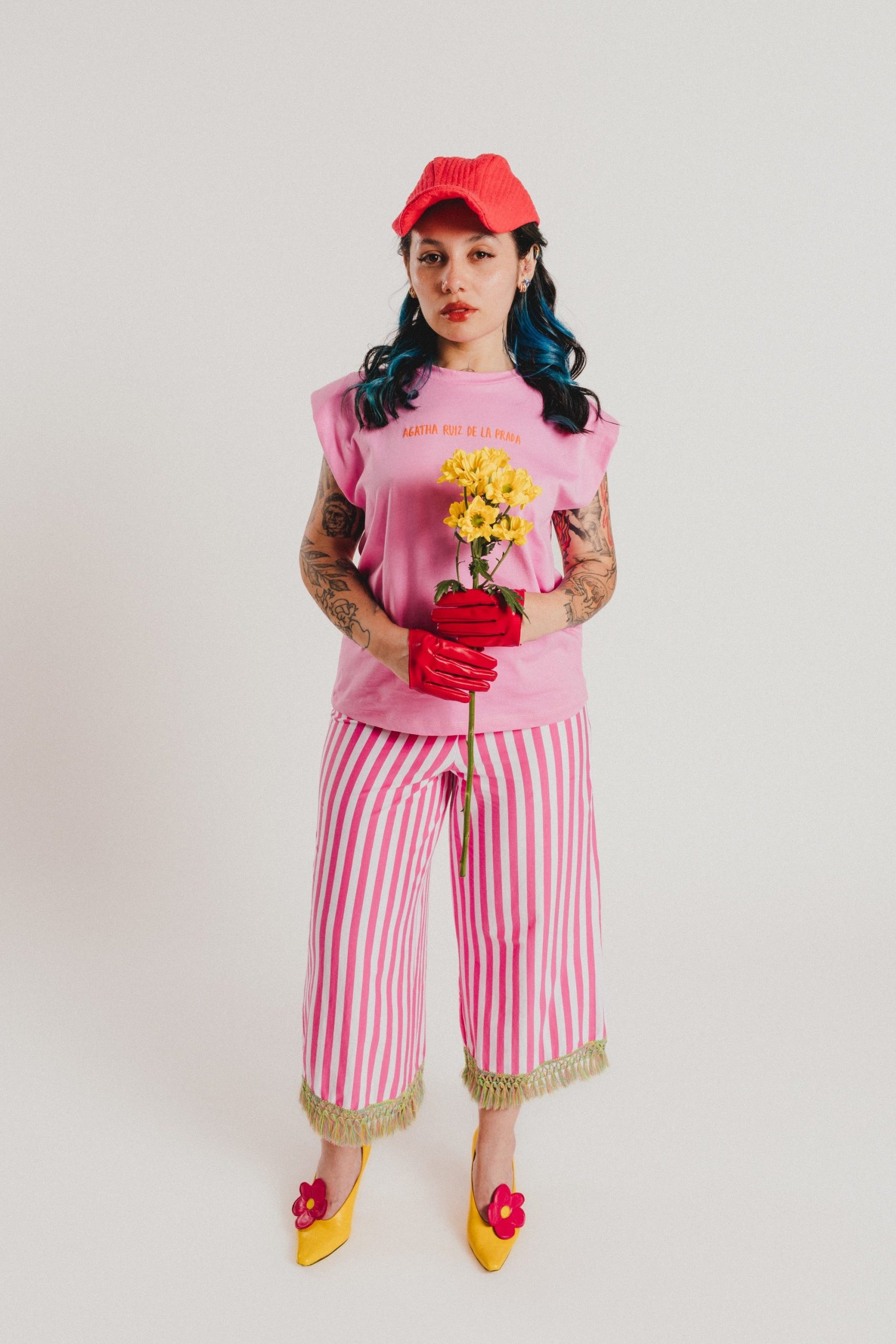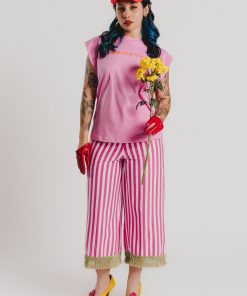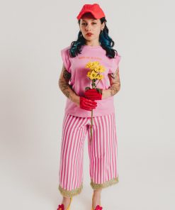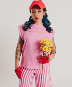 Pink sleeveless T-shirt with shoulder pads and a round neckline featuring our AGATHA RUIZ DE LA PRADA branding in the center. Regular fit. Sizes: from 36 to 44. Model’s height: 1’80 cm. Photo size: 38. Machine wash max 30ºC. Do not bleach. Do not tumble dry. Iron max 110ºC. 100% COTTON.