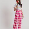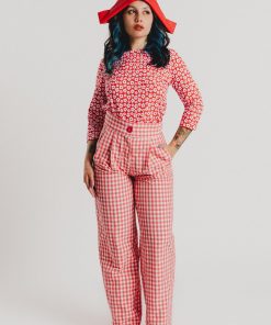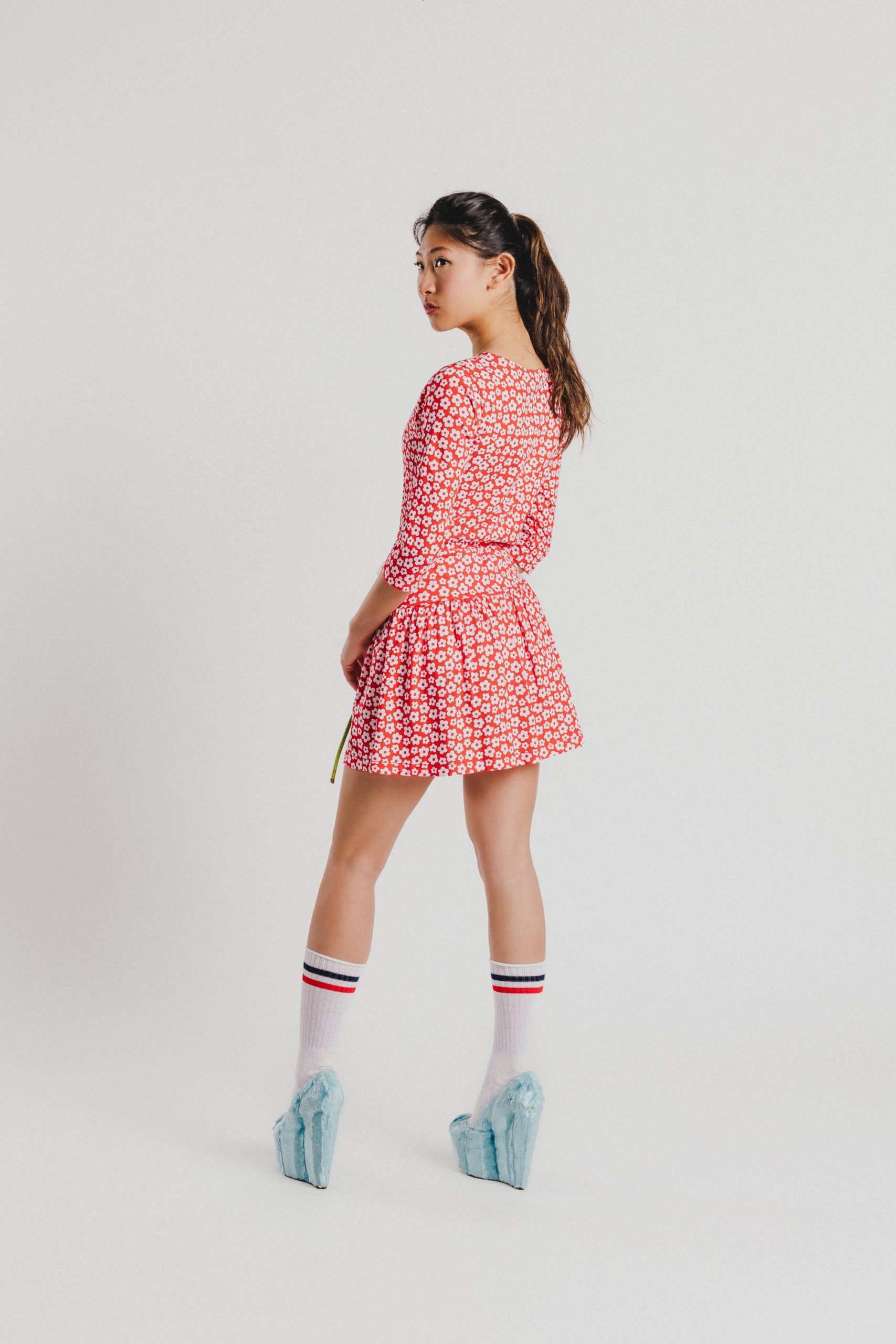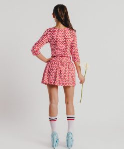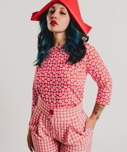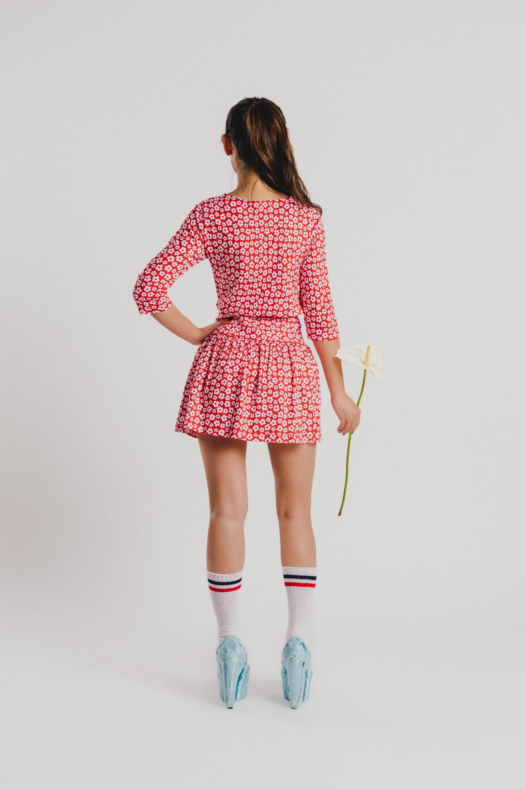 Crew-neck T-shirt with French sleeves and a white floral print on a red background. Regular fit. Sizes: 36 to 44. Model’s height: 173 cm. Photo size: 38. Machine wash max 30°C. Do not bleach. Do not tumble dry. Iron max 110°C. Composition: 96% COTTON and 4% ELASTANE.