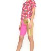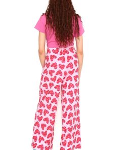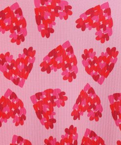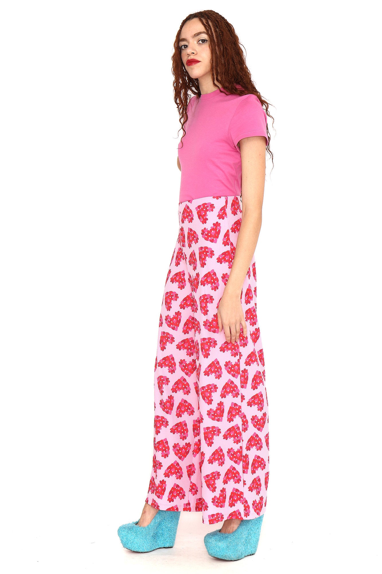 Pink ribbed trousers with a fuchsia petal heart and elastic waistband. Sizes: 36-S / M- 40-L / XL. Machine wash max 30ºC. Do not bleach. Do not tumble dry. Iron max 110ºC. Composition: 67% CLY 29% CO 4% ELASTANE.