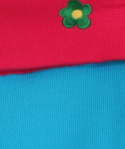 Turquoise ribbed dress with a fuchsia boat neckline. True to size. Sizes: 36 to 44. Model’s height: 173 cm. Photo size: 38. Machine wash max 30°C. Do not bleach. Do not tumble dry. Iron max 110°C. 96% COTTON 4% ELASTANE.
