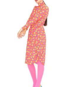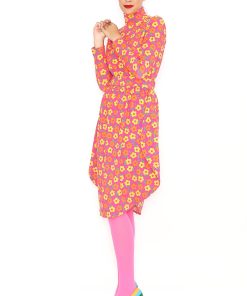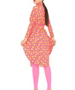Orange circle skirt with a yellow floral print and elastic waistband. Sizes 36 to 44. Machine wash at a maximum temperature of 30°C. Do not bleach. Do not tumble dry. Iron at a maximum temperature of 110°C. 96% COTTON; 4% SPANDEX