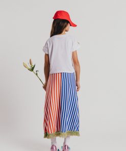 Vertical stripe midi skirt in two colors: blue and orange, elastic waistband, and fringed trim. Regular fit. Sizes: from 36 to 44. Model’s height: 1’80 cm. Photo size: 38. Machine wash max 30ºC. Do not bleach. Do not tumble dry. Iron max 110ºC. 100% COTTON.