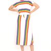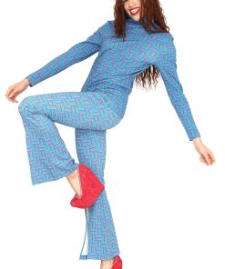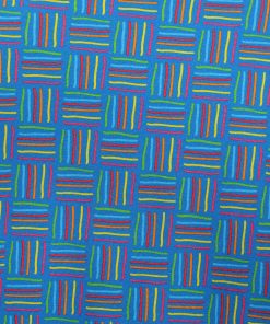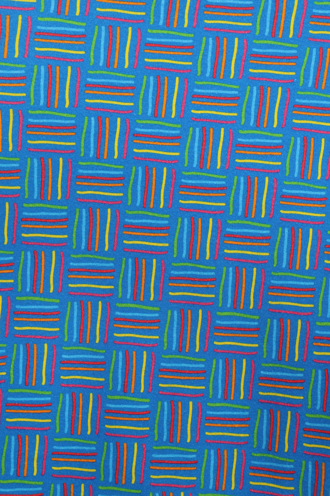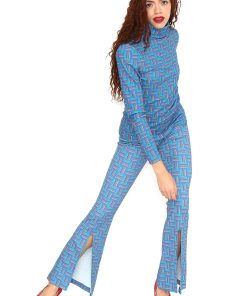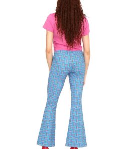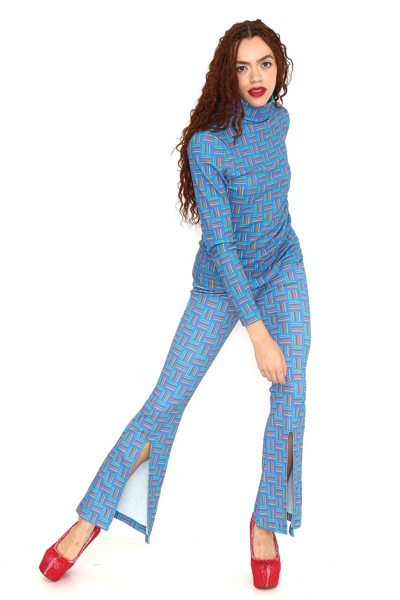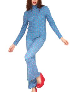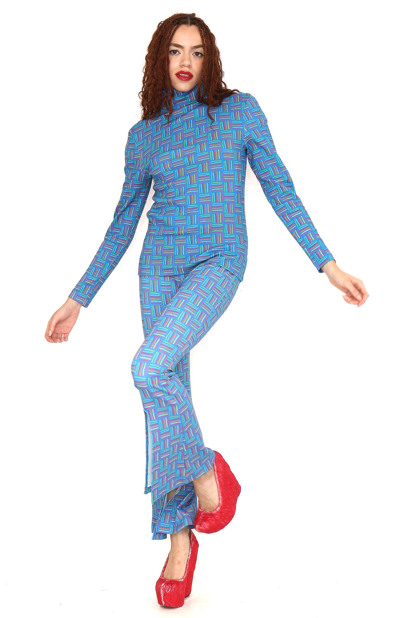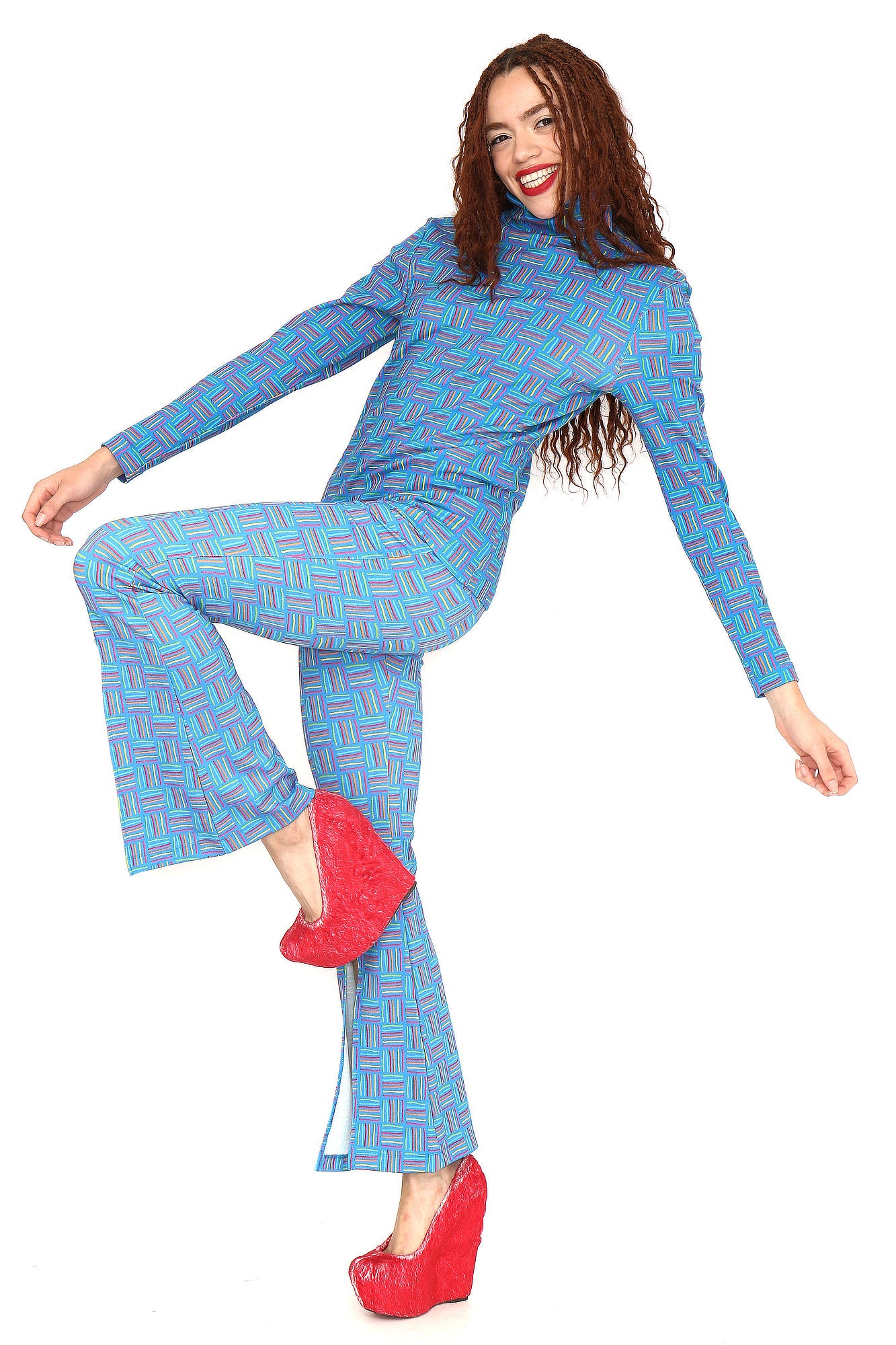 Flared trousers with a front slit and elastic waistband. Printed on a blue background with a square pattern formed by colored stripes. Regular fit. Sizes: from 36 to 44. Machine wash at a maximum temperature of 30°C. Do not bleach. Do not tumble dry. Iron at a maximum temperature of 110°C. Composition: 96% Polyester, 4% Elastane.