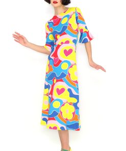 Long midi dress with French sleeves and a ruffled finish in a multi-colored print. Sizes range from 36 to 44. Model’s height: 1’80 cm. Photo size: 38. Machine wash at a maximum of 30°C. Short spin cycle. Do not bleach. Iron at a maximum of 150°C. Do not dry clean. Do not tumble dry. Composition: 96% COTTON; 4% SPANDEX