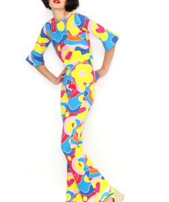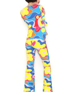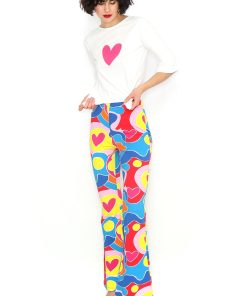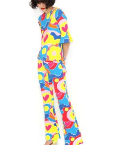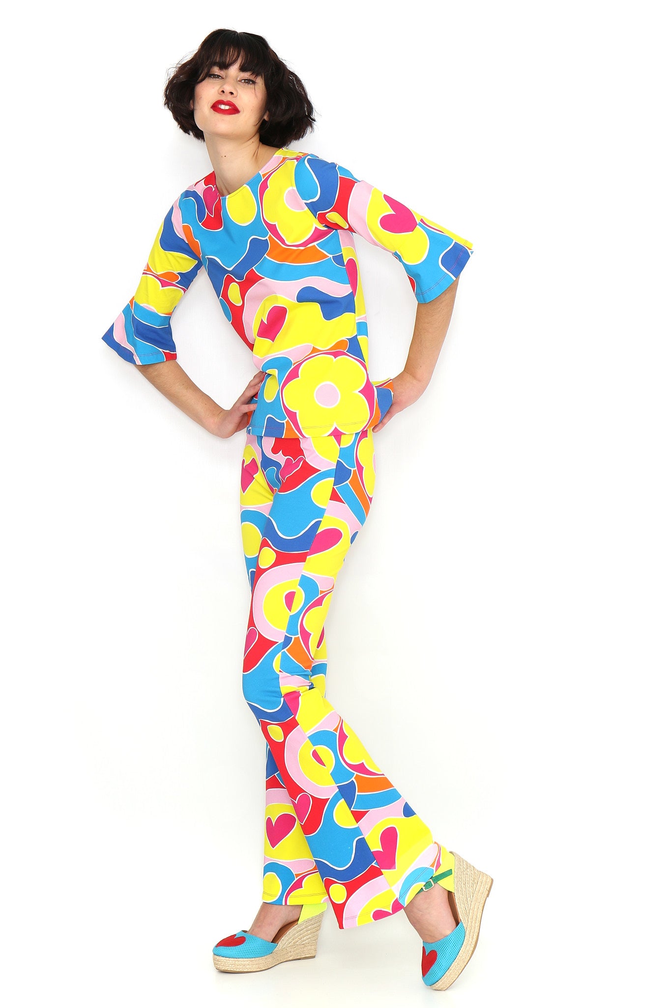Pantalón de algodón flare de algodon estampado multicolor y cinturilla elástica. Talla normal. Tallas: 36/S/M y 40/L/XL. Lavar a maquina máx 30ºC . No usar lejía/blanqueador. No usar secadora. Planchado máximo 110ºC. Composición: 95% poliester y 5% elastano.