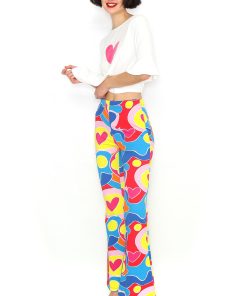 Pantalón de algodón flare de algodon estampado multicolor y cinturilla elástica. Talla normal. Tallas: 36/S/M y 40/L/XL. Lavar a maquina máx 30ºC . No usar lejía/blanqueador. No usar secadora. Planchado máximo 110ºC. Composición: 95% poliester y 5% elastano.
