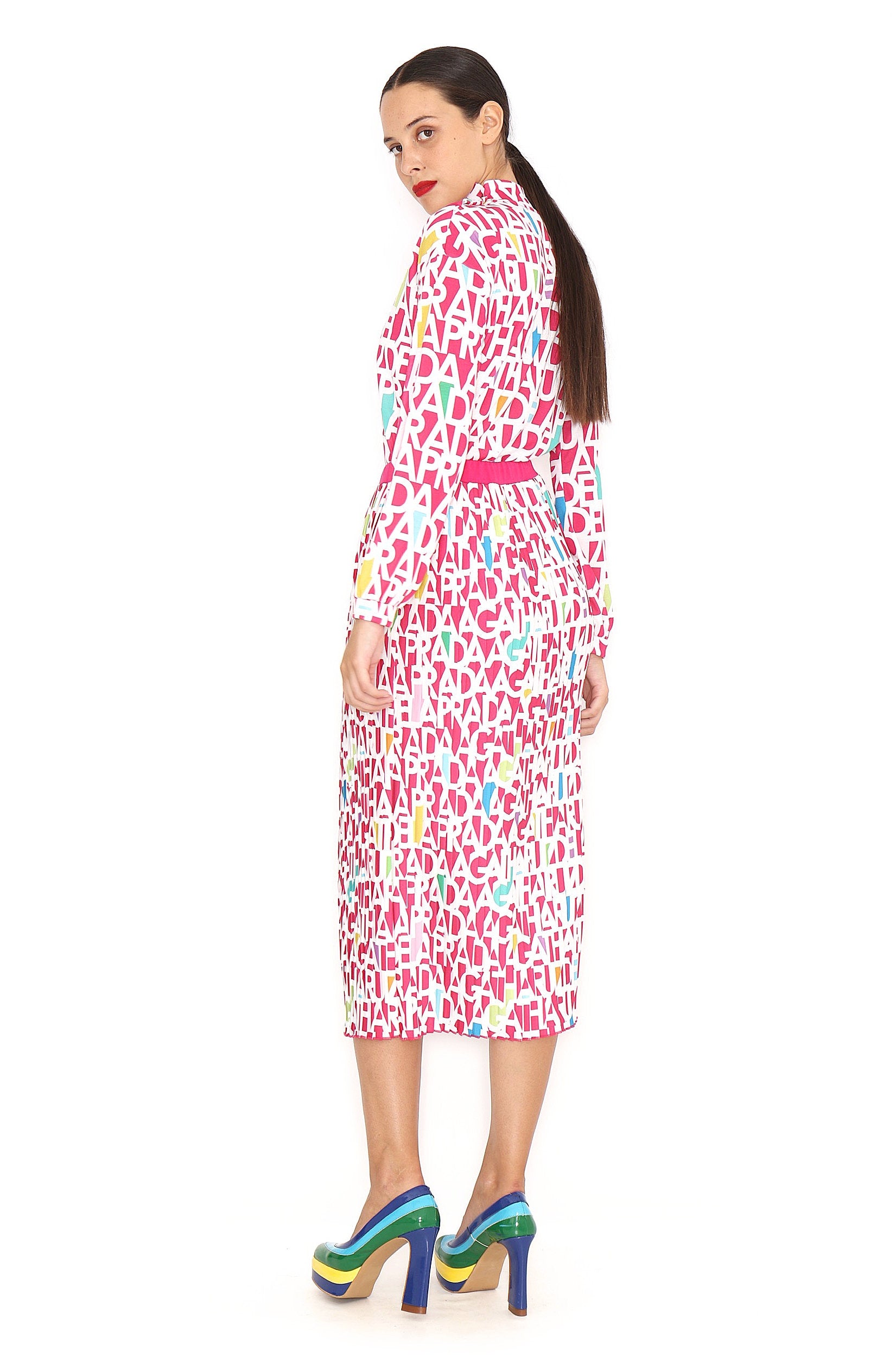 Long pleated skirt with white ARP lettering on a fuchsia background, elastic waistband. Sizes from 36 to 44. Machine wash at a maximum temperature of 30°C. Do not bleach. Do not tumble dry. Iron at a maximum temperature of 110°C. 97% Polyester, 3% Elastane