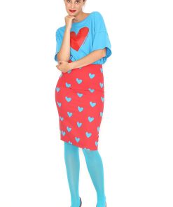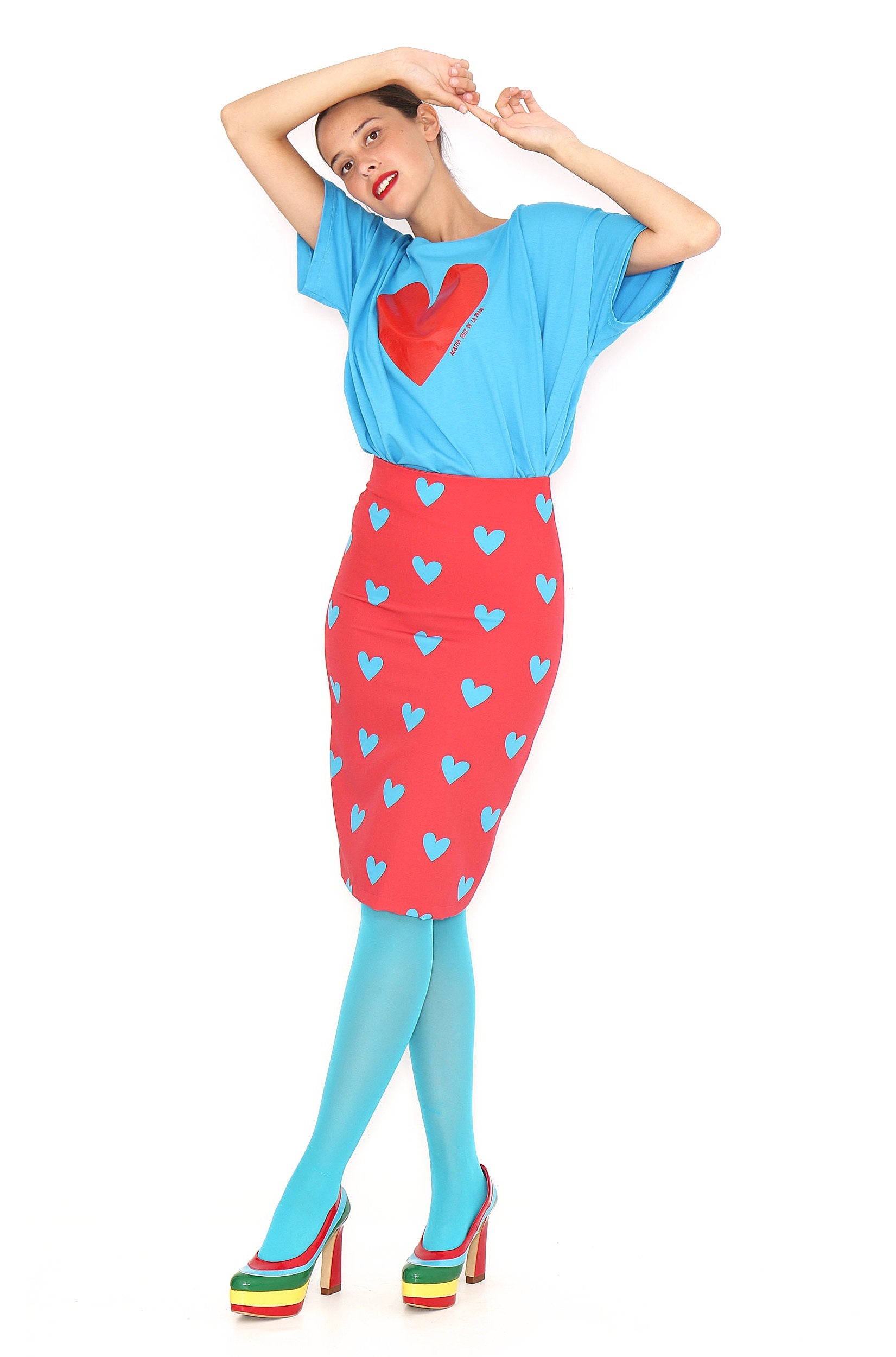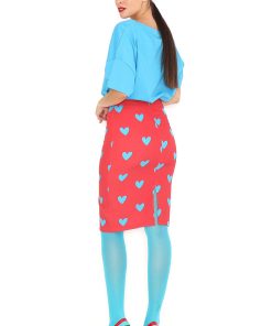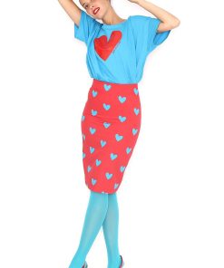 Red pencil skirt with blue hearts and elastic waistband. Sizes from 36 to 44. Machine wash at a maximum temperature of 30°C. Do not bleach. Do not tumble dry. Iron at a maximum temperature of 110°C. 88% Polyester, 12% Spandex