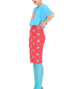 Red pencil skirt with blue hearts and elastic waistband. Sizes from 36 to 44. Machine wash at a maximum temperature of 30°C. Do not bleach. Do not tumble dry. Iron at a maximum temperature of 110°C. 88% Polyester, 12% Spandex