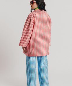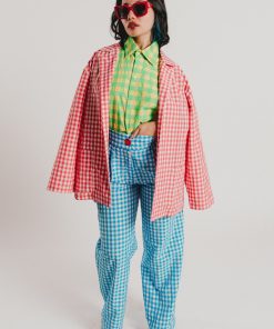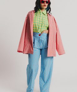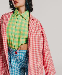 Red gingham blazer, buttonless. Large size. Two sizes: S/M – L/XL. Machine wash max 30°C. Do not bleach. Do not tumble dry. Iron inside out, max 90°C. COMPOSITION: 92% POLYESTER 8% POLYURETHANE.