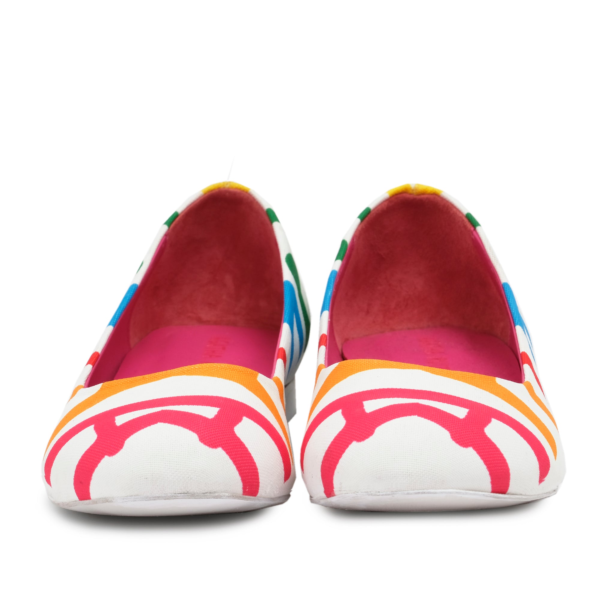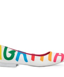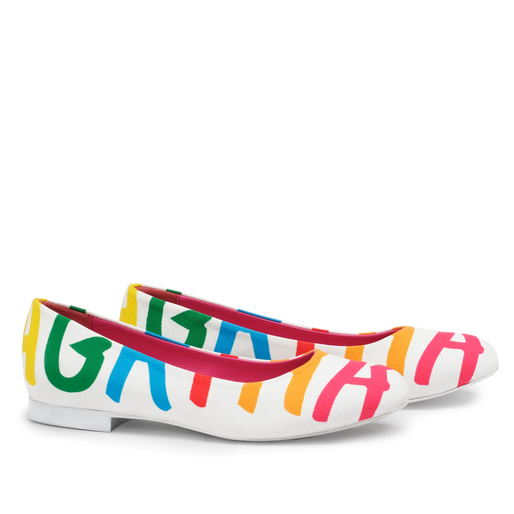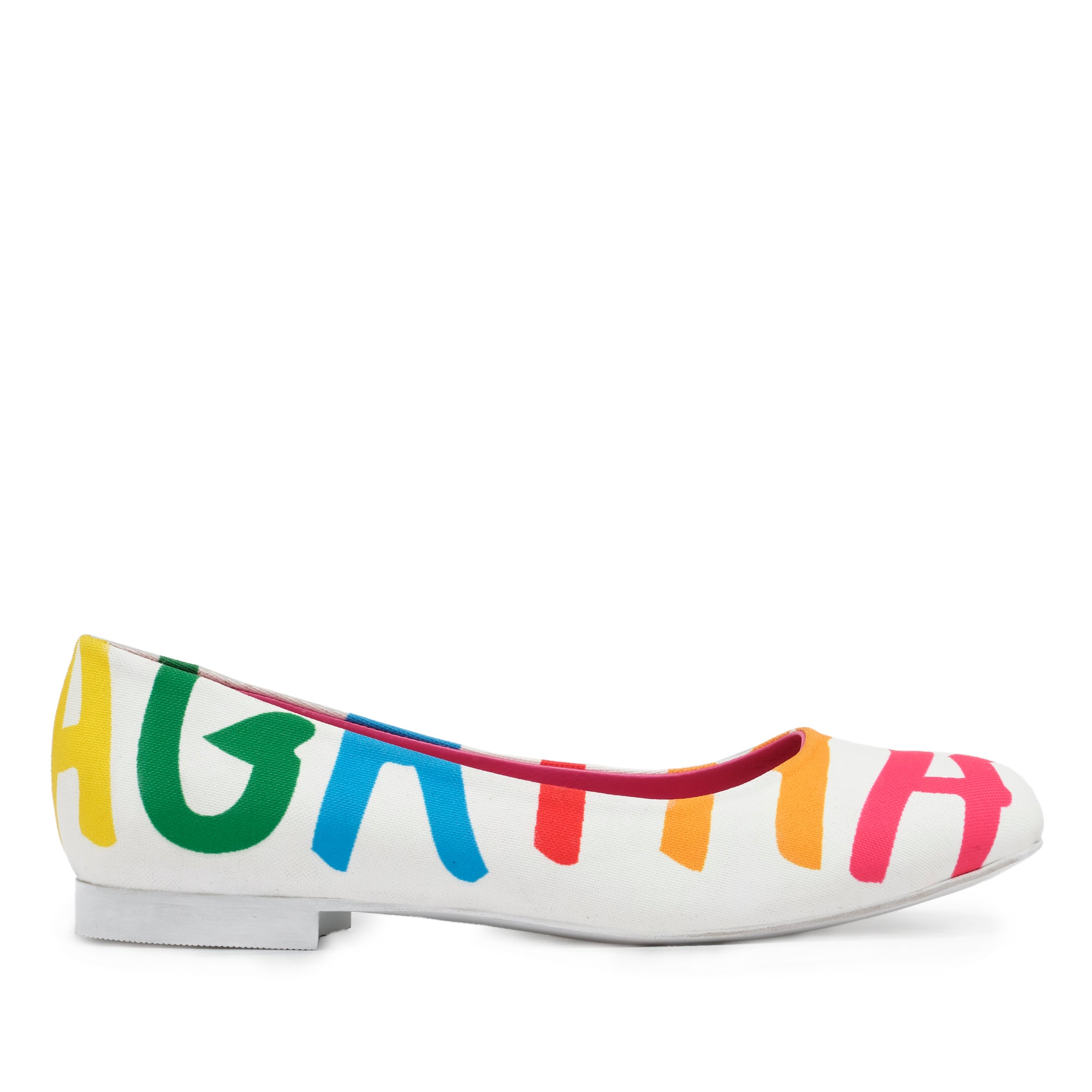 White fabric ballerina flat with the colorful AGATHA name in a large size. The sole is fuchsia and the heel is 1.5 cm. Made in Spain. Outer material: Fabric. Inner material: Leather. Sole material: Synthetic.