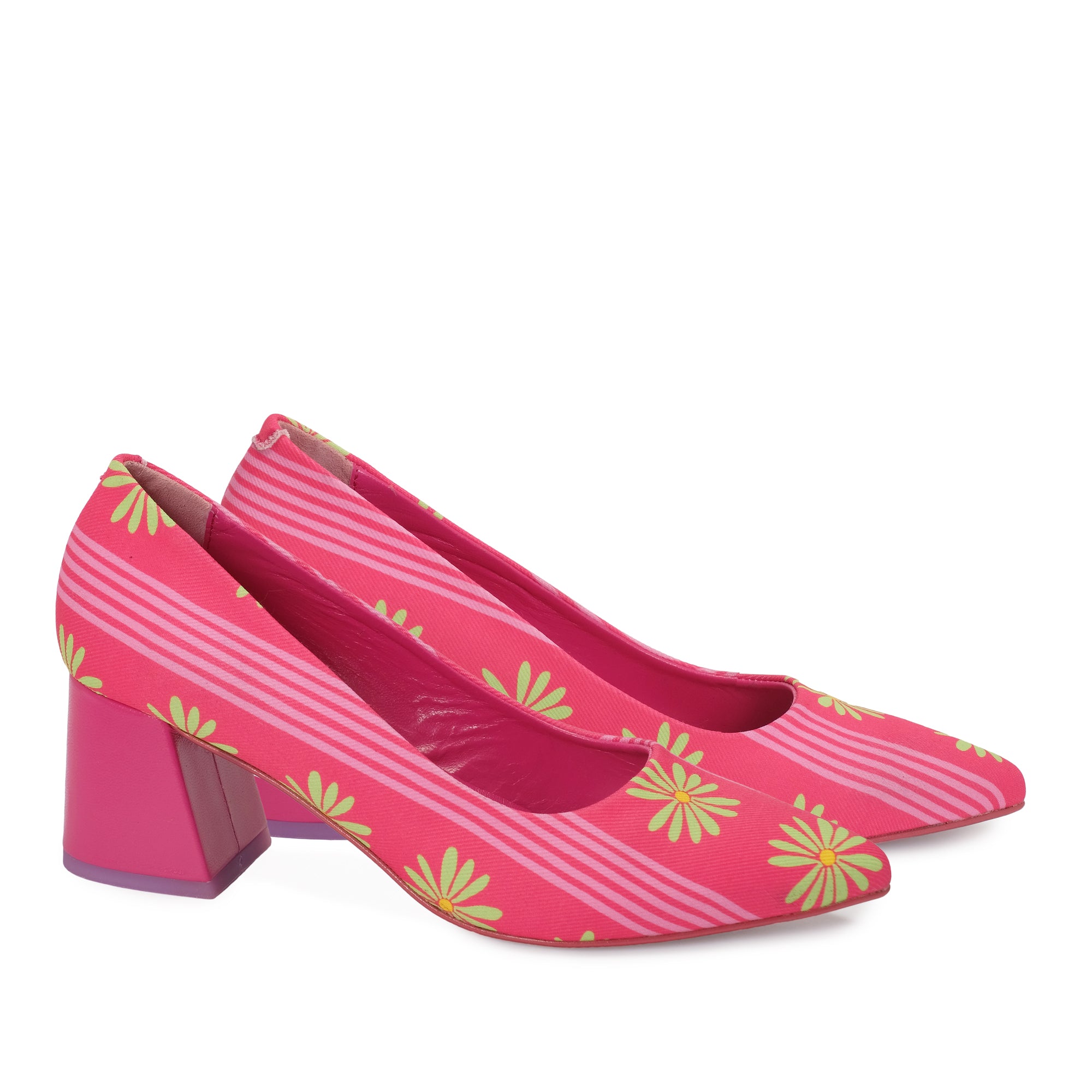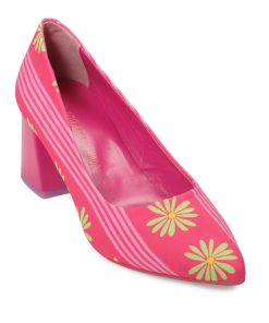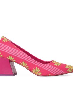 Fuchsia fabric court shoe with a pistachio-colored floral print and pink stripes, elephant-shaped heel, fuchsia court shoe. 6.5 cm heel. Made in Spain. Outer material: Leather. Inner material: Leather. Sole material: Synthetic.
