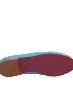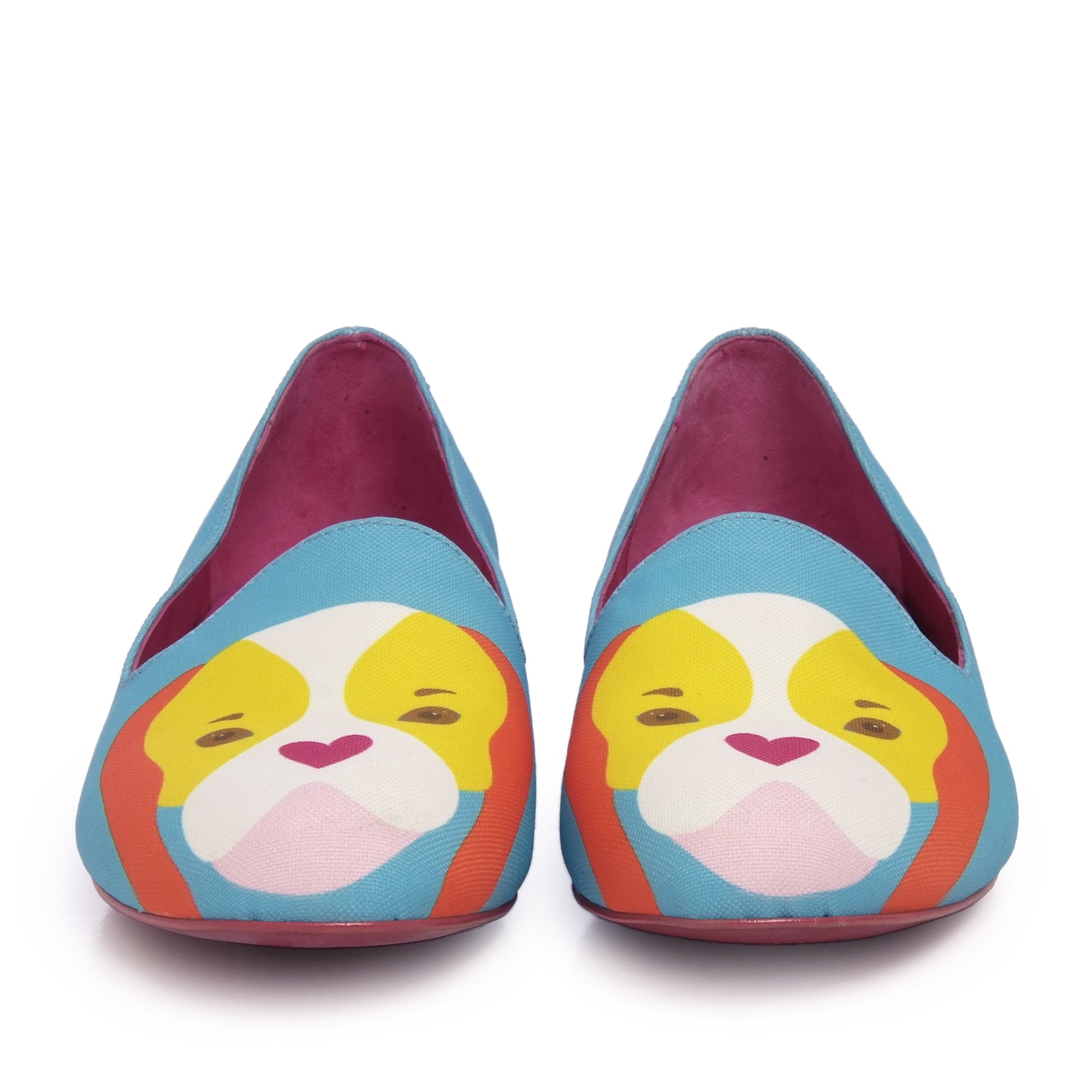Slipper de color turquesa y en la punta la cara de Jimmy en colores naranja, blanco y amarillo y siela prefabricada en color fucsia. Tacón normal de 1,3 cm. Hecho en España. Material exterior: Tejido. Material interior: Piel Cabra. Material interior suela: Cuero Lite sintético.