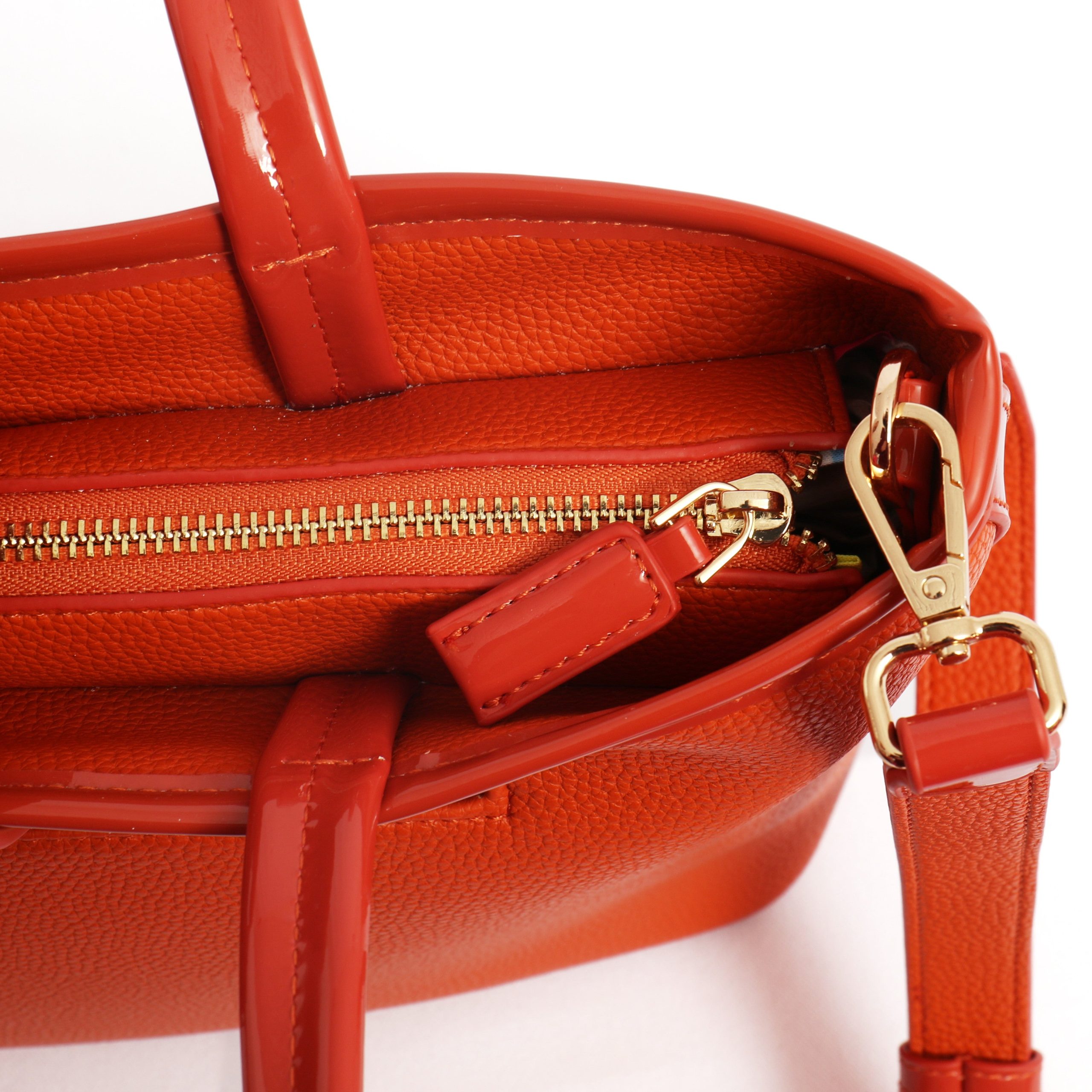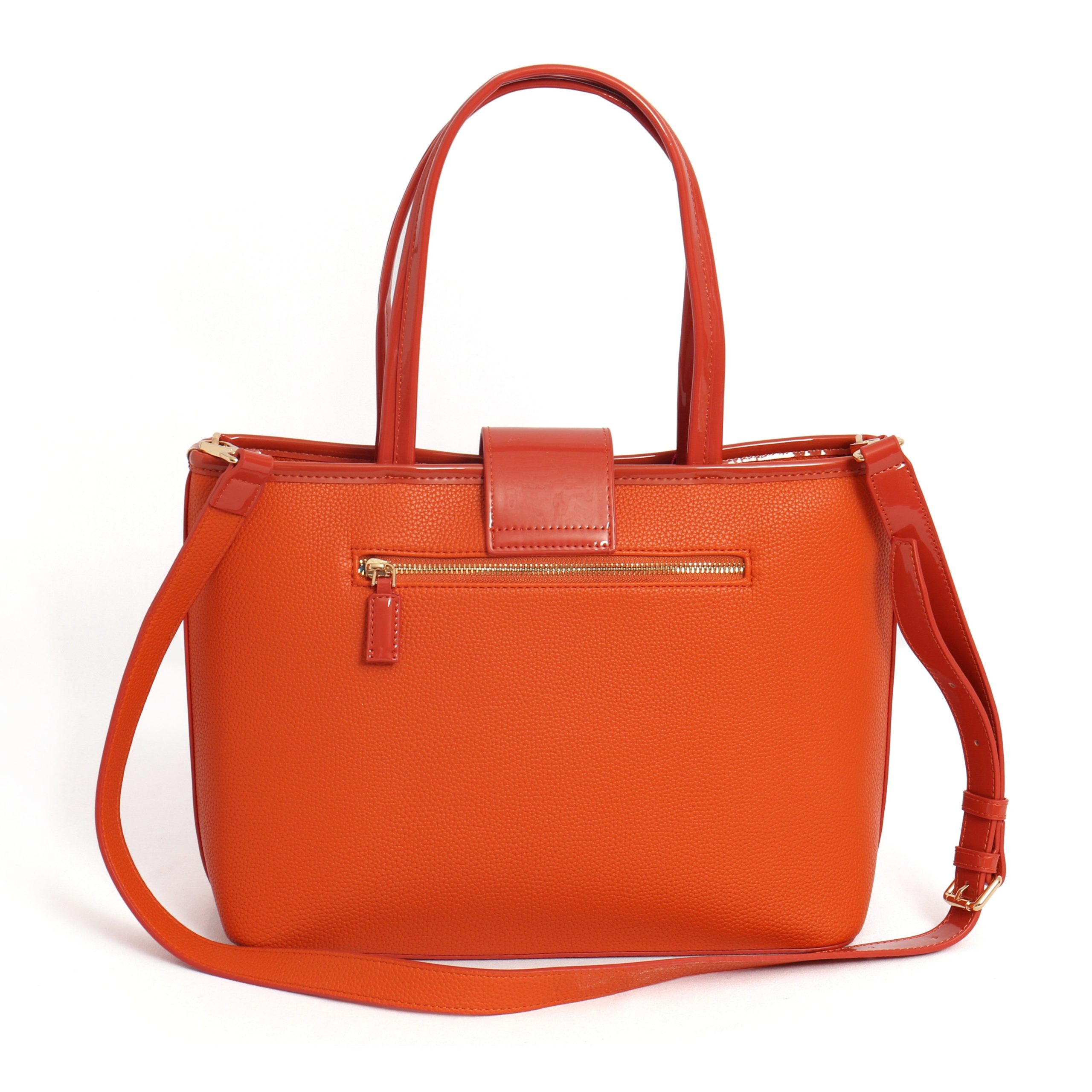 Orange ARP shopper bag. Colored striped lining and two pockets, one with a zipper. Zipper closure with adjustable strap. Dimensions: 32 x 26 x 12 cm.
