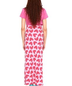 Pink ribbed skirt with an orange elastic waistband. Sizes 36 to 44. Machine wash at a maximum temperature of 30°C. Do not bleach. Do not tumble dry. Iron at a maximum temperature of 110°C. Composition: 67% CLY, 29% CO, 4% ELASTANE.