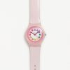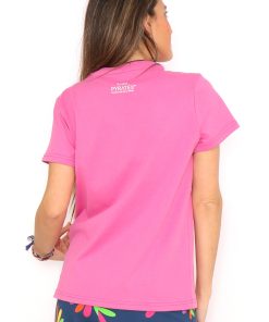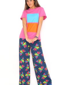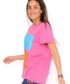 Fuchsia fitted t-shirt with two blue and orange squares in the center.