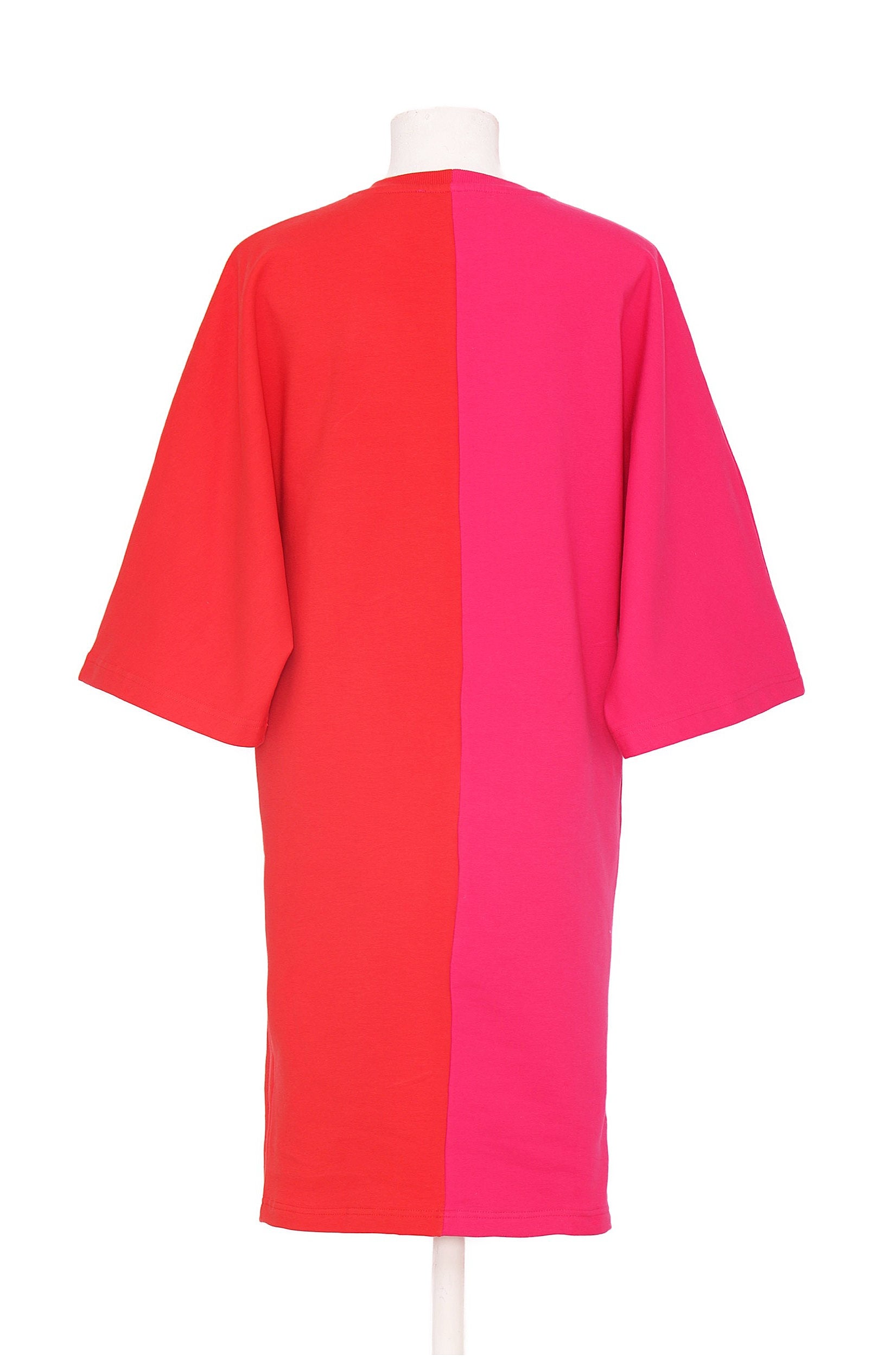 Fuchsia and red two-tone dress with a blue star. Sizes range from 36 to 44. Machine wash at a maximum of 30°C. Short spin cycle. Do not bleach. Iron at a maximum of 150°C. Do not dry clean. Do not tumble dry. Composition: 96% cotton; 4% spandex.