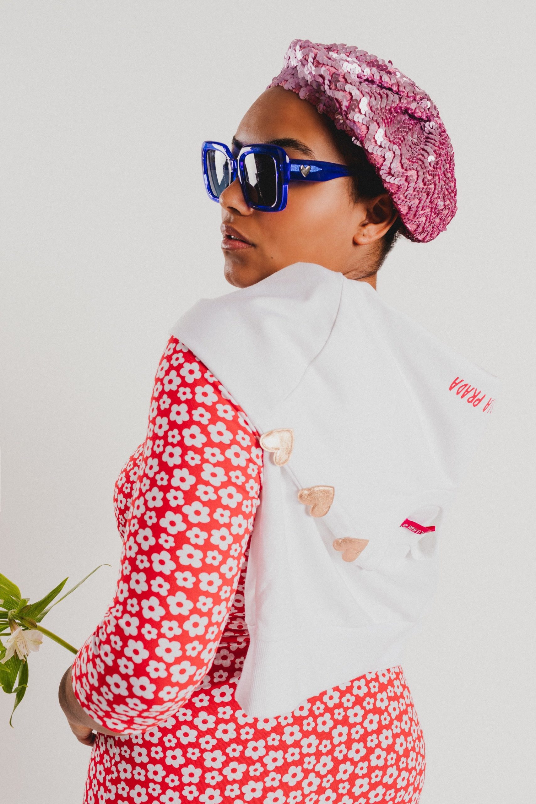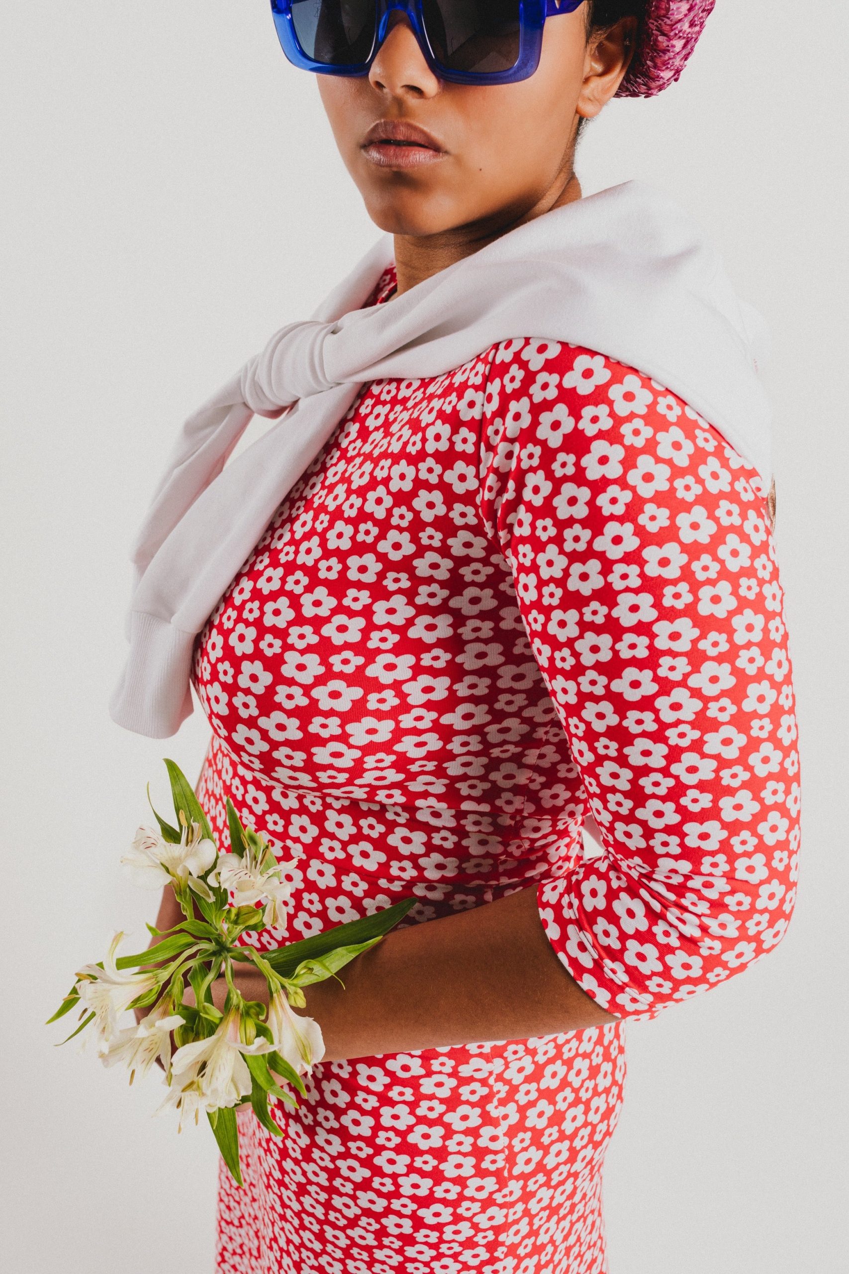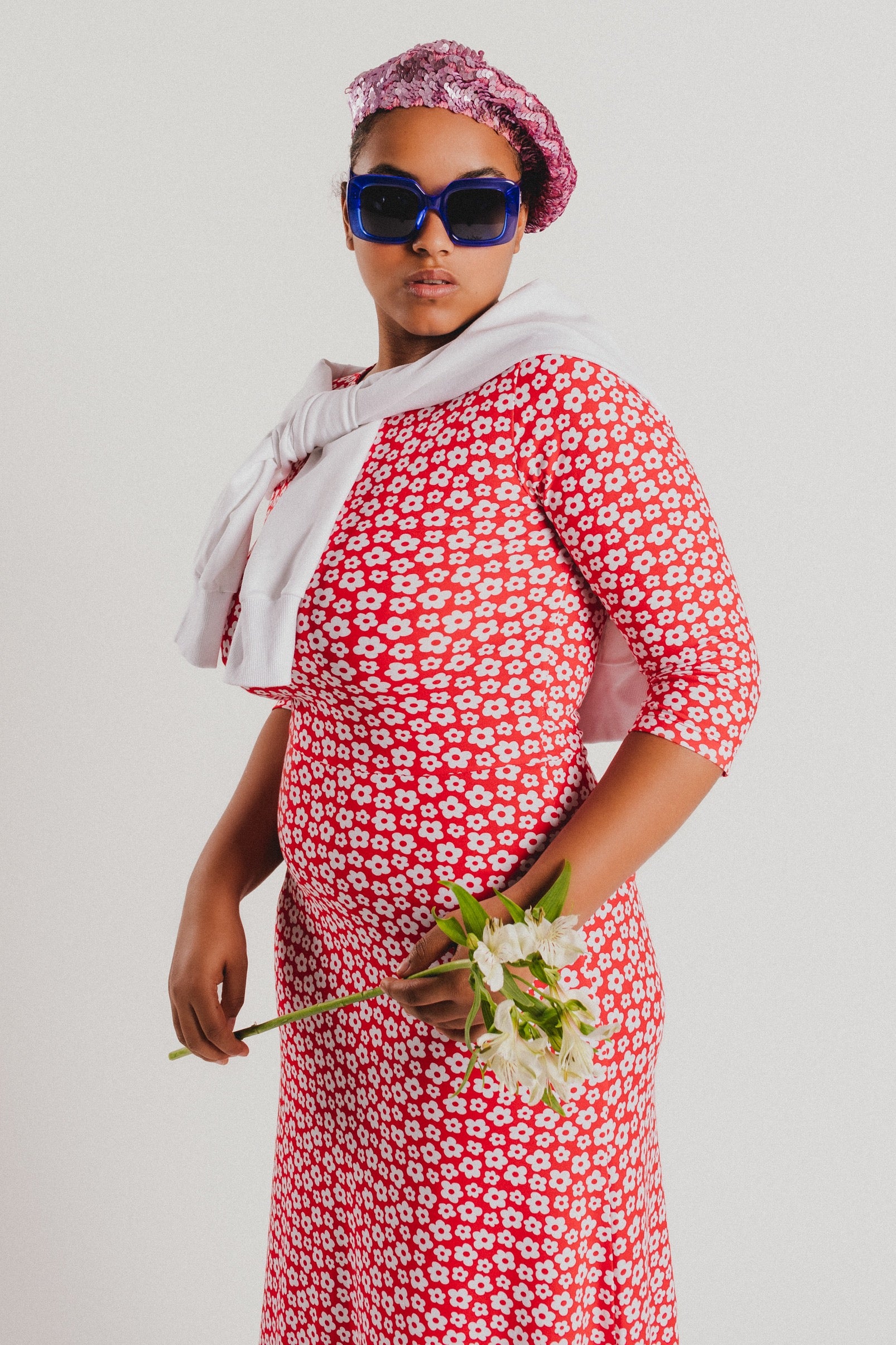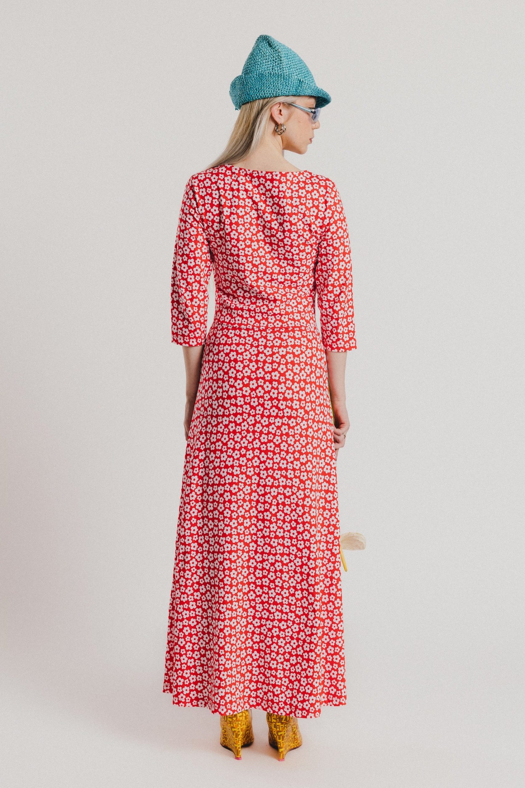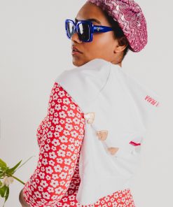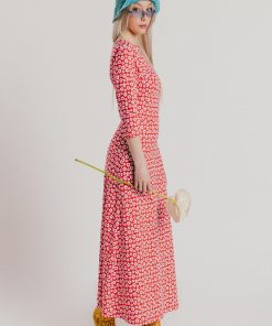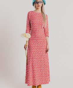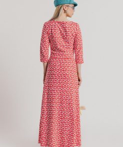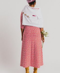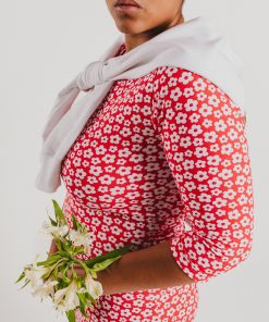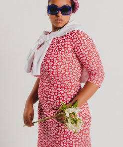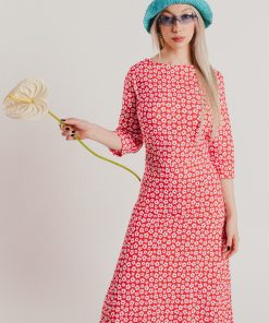 Crew-neck dress with French sleeves and a midi length, featuring a white floral print on a red background. Regular fit. Sizes: from 36 to 44. Model’s height: 1’80 cm. Photo size: 38. Machine wash max 30ºC. Do not bleach. Do not tumble dry. Iron max 110ºC. Composition: 96% COTTON and 4% ELASTANE.