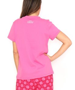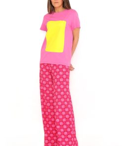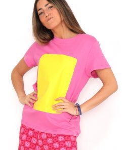 Fuchsia fitted t-shirt with a yellow square in the center.